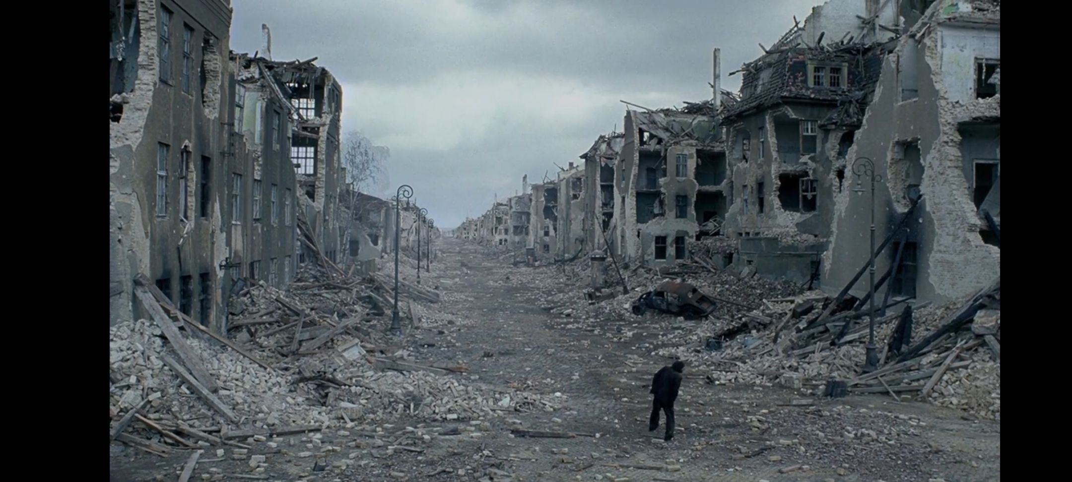 在逃亡的过程中,他从一位衣冠楚楚,风度翩翩的贵公子变成了衣衫褴褛,步履蹒跚的"垂暮老人",为了生存,他吃着发霉的土豆,喝着医院的馊水,给纳粹军官下跪为求苟延残喘,他像老鼠一样躲避于城市的残骸,他无处为家,周遭能留给他的也只有纷纷飘洒的苦雨,他被纳粹的恐怖扼住咽喉。