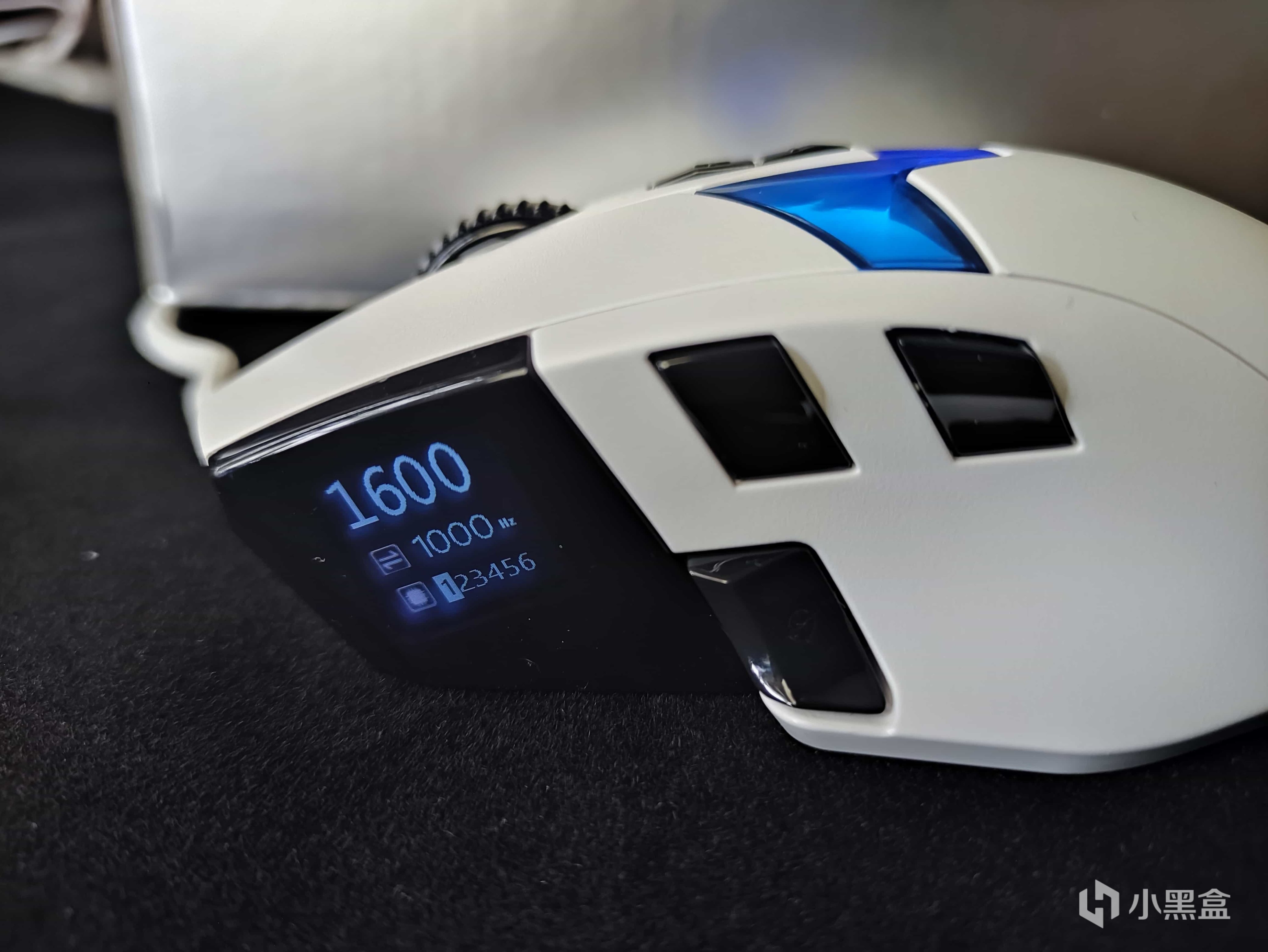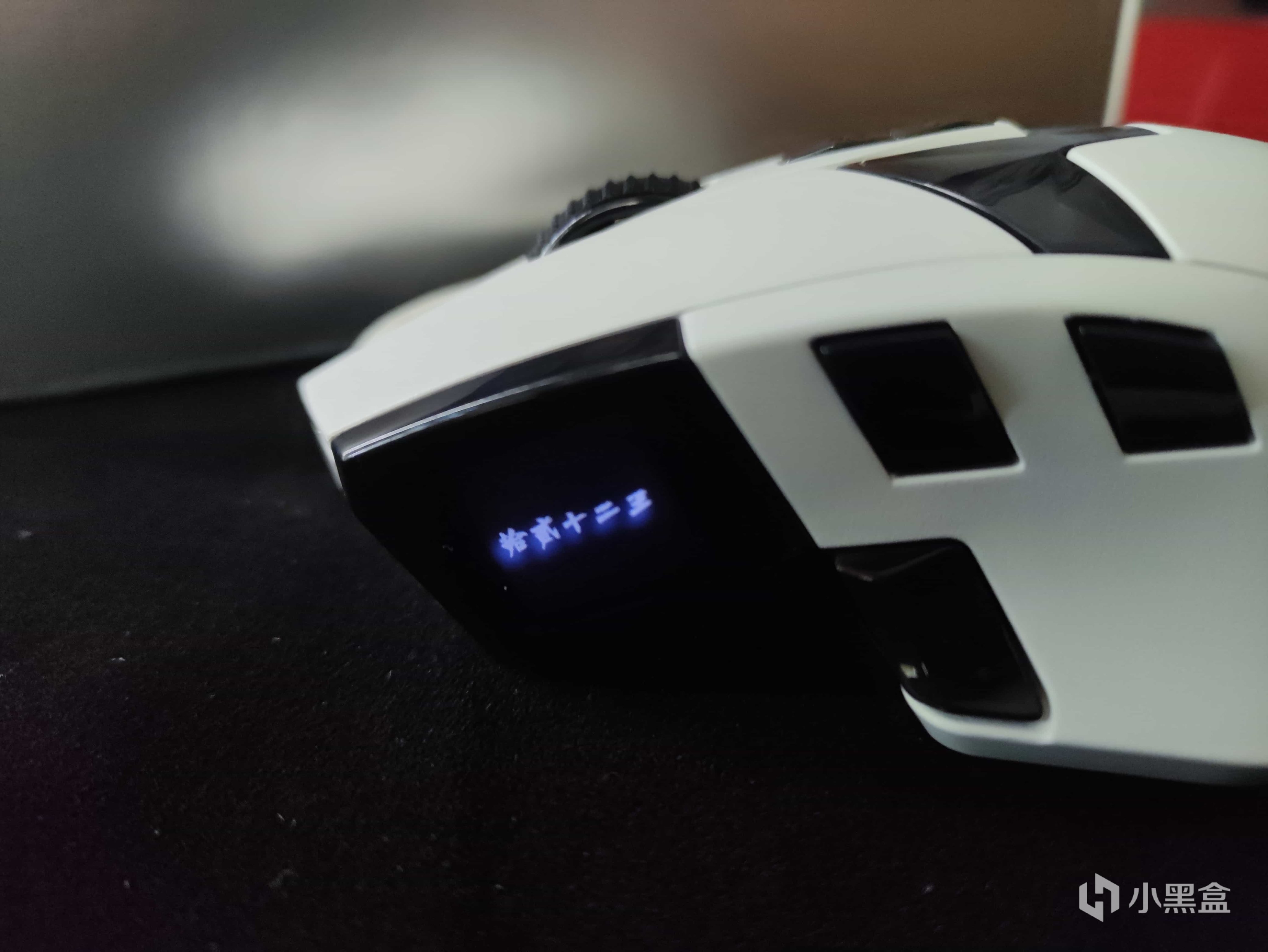 而鼠标的左侧有着十分多内容,一块0.85寸TFT的液晶显示屏,可以自定义GIF动画或是显示鼠标设置的参数信息。左侧上方是两个凸出来的侧键,下方的一个侧键是可以切换动画内容。