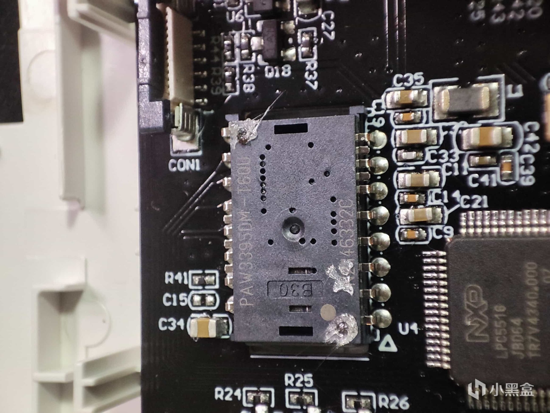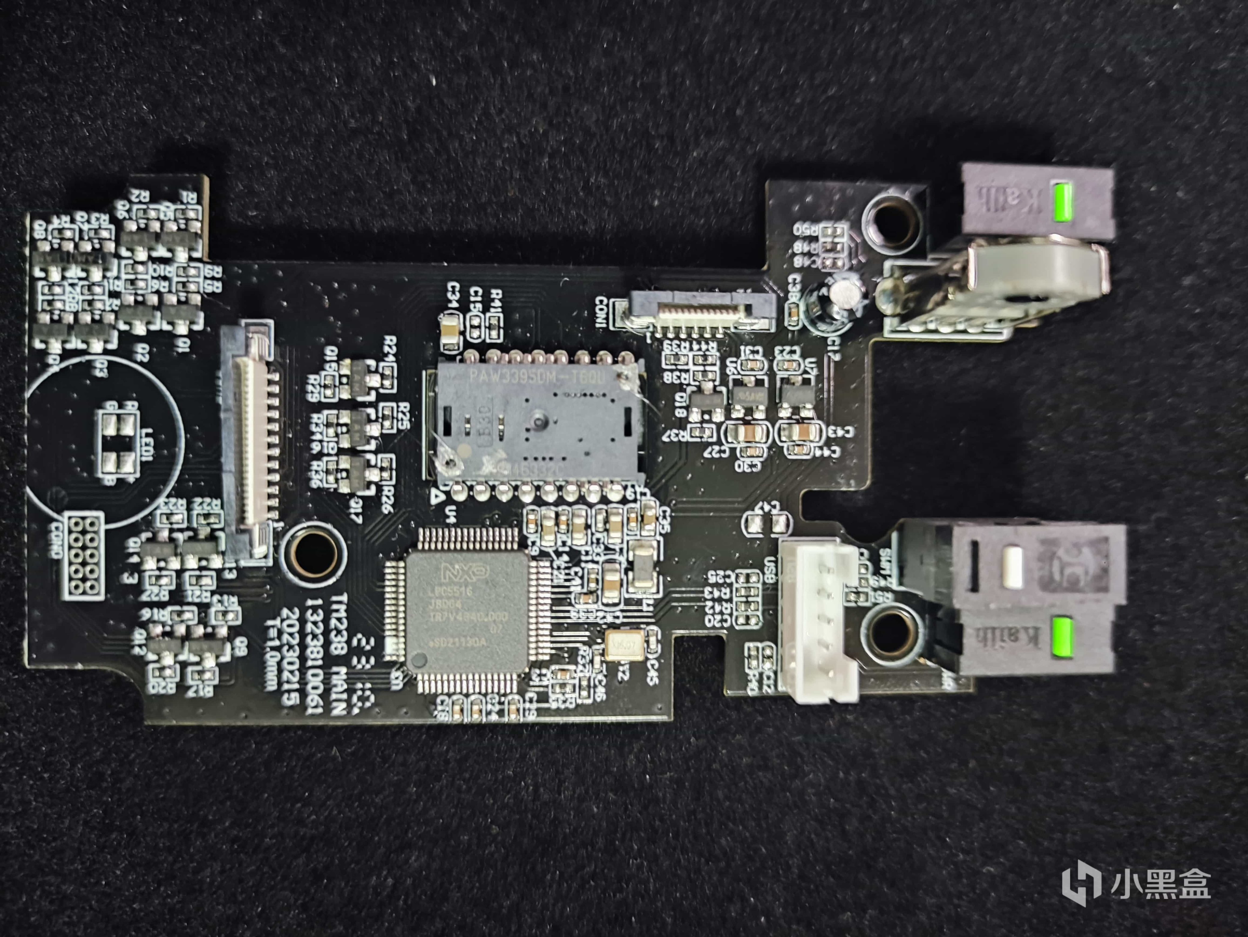 然后你就可以看见鼠标的主控板,鼠标采用的是PAW3395的传感器,凯华的8000万次使用寿命的光微动。