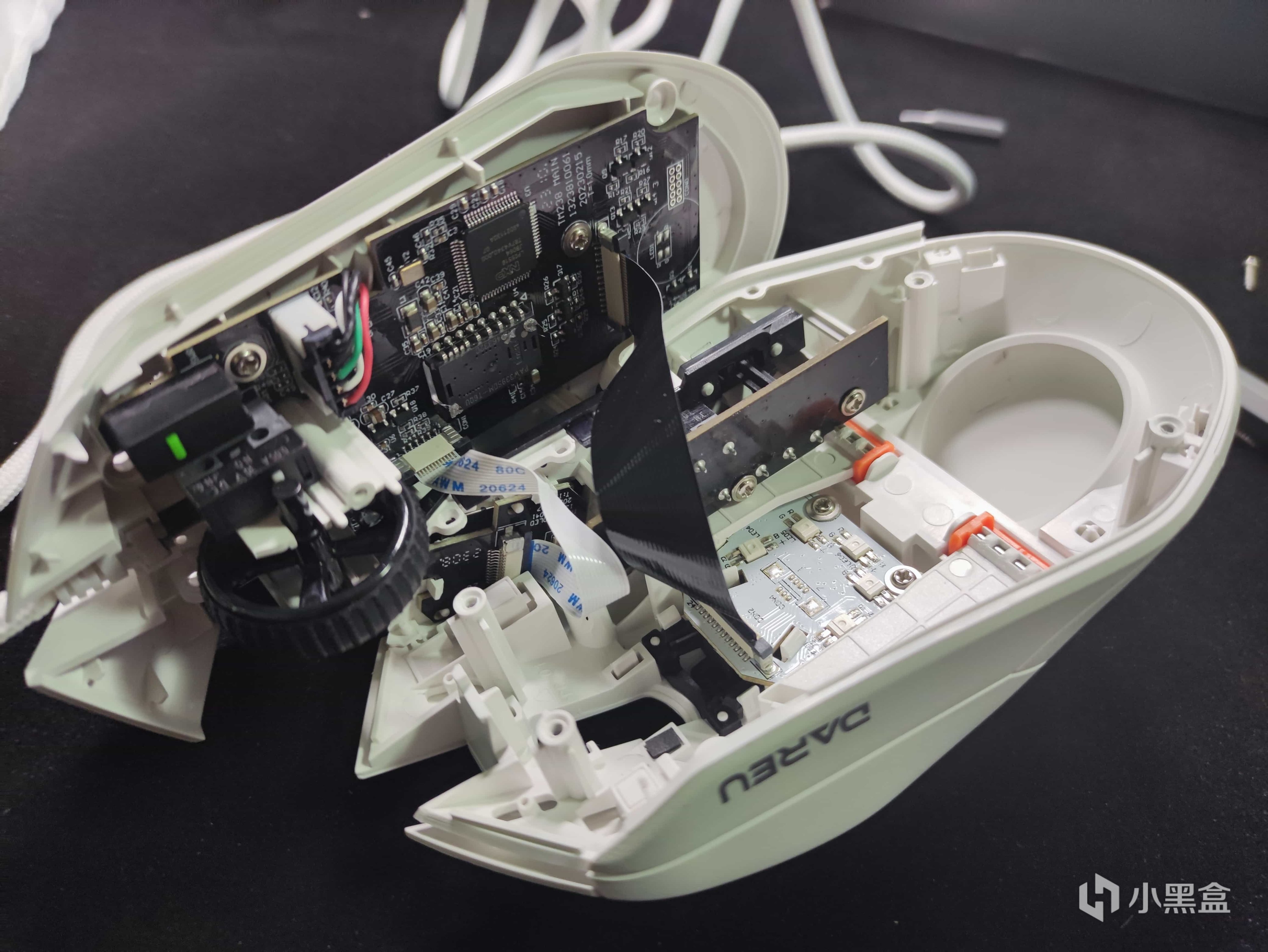 然后就可以十分轻松的打开鼠标的上盖,里面有着两个供电线,一个连接着鼠标上方的灯带,一个连接着前方的小屏幕,记得把线拔下来。