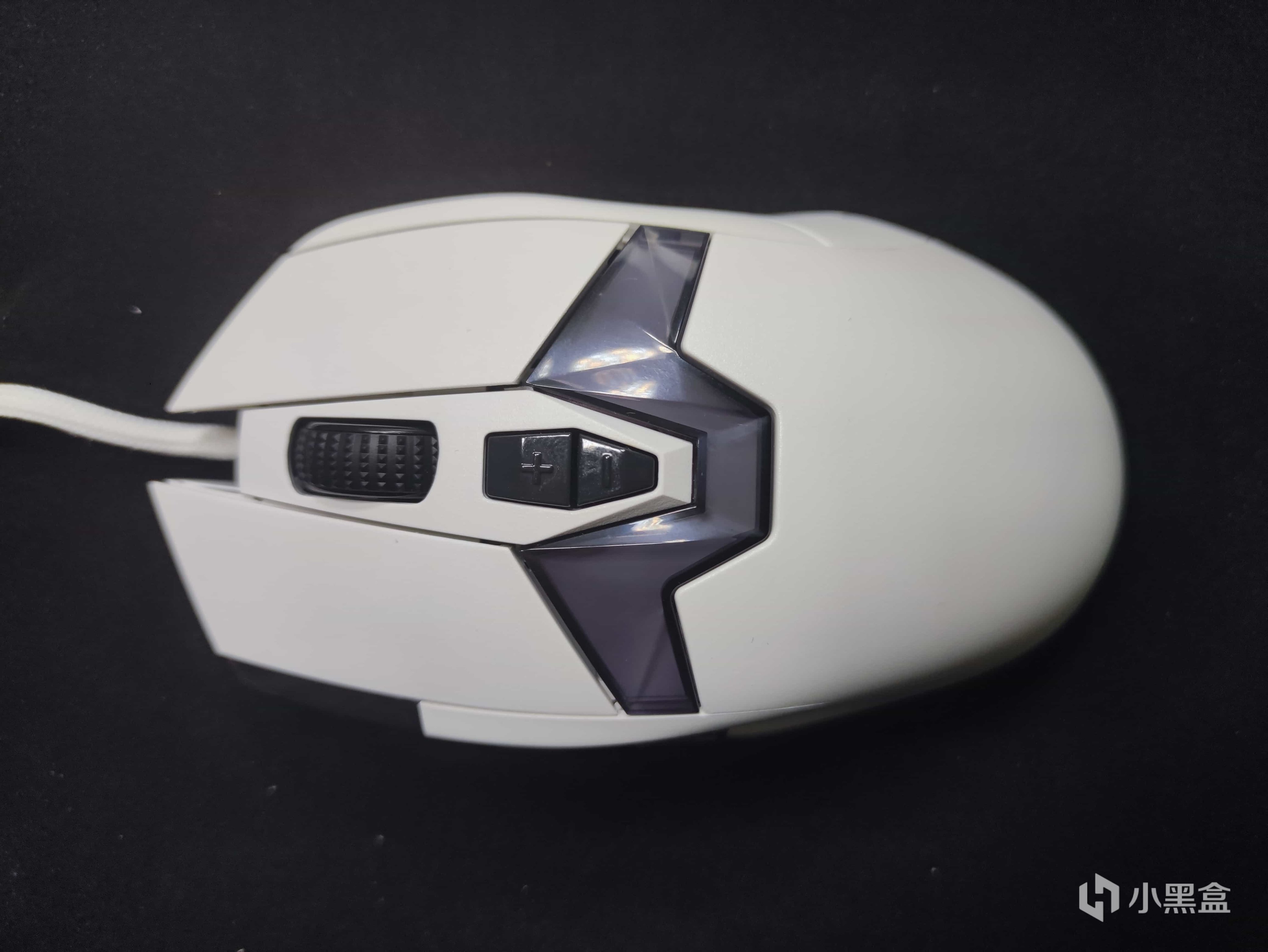 鼠标的正上方是这款鼠标大到夸张的RGB灯带,由于其较大的面积也为玩家带来了十分多样的灯光选择。而在灯带上方是DPI调节按键。