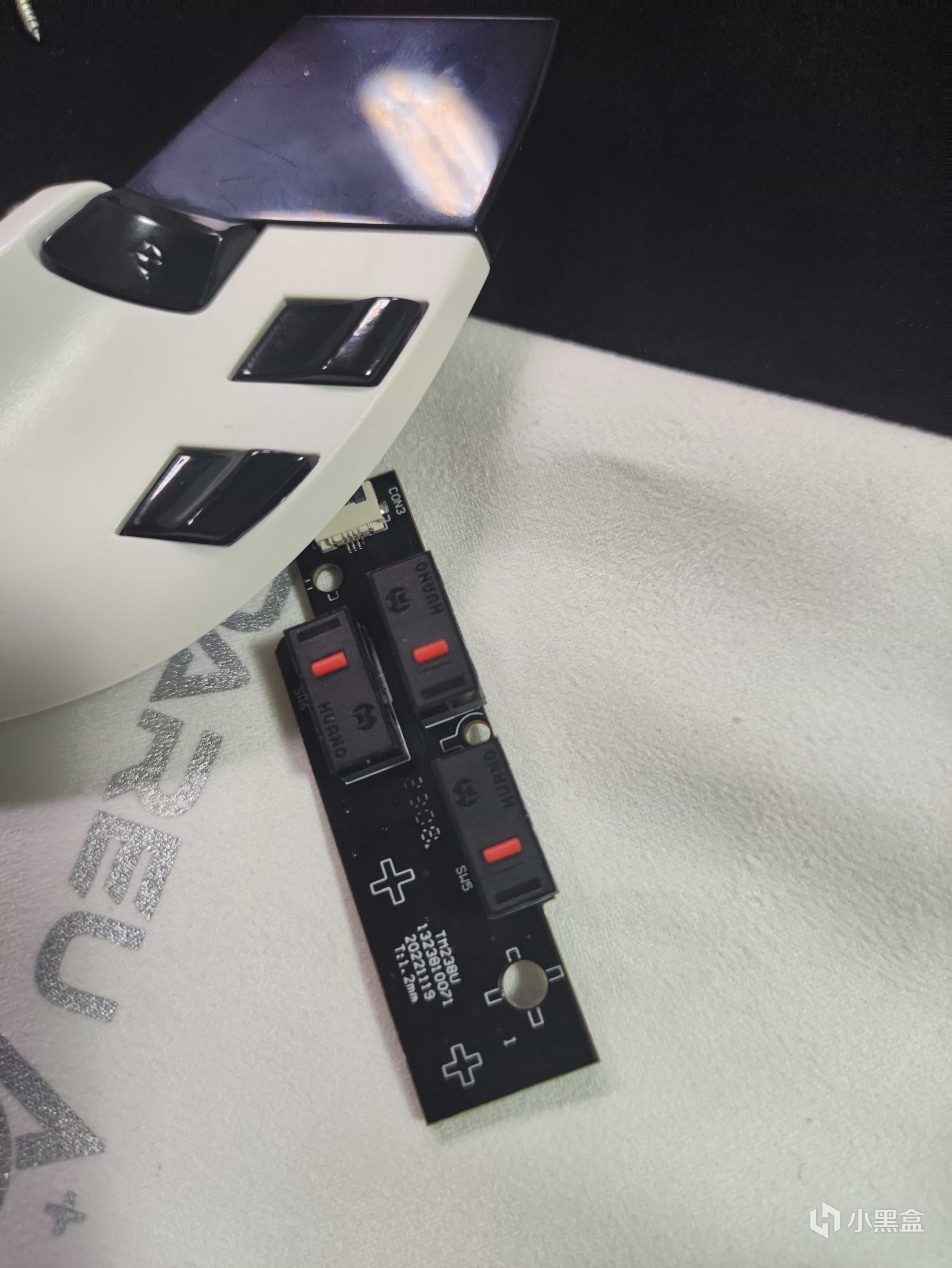 看完鼠标的主控板,再看鼠标的上盖,鼠标上盖的侧板由卡榫结构固定可以拆下。