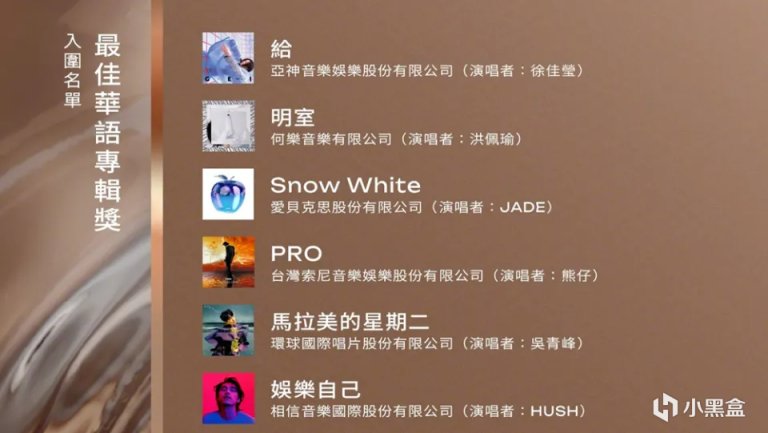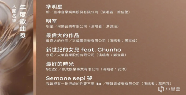 除了伟作外,徐佳莹的《准明星》、洪佩瑜《明室》、郑宜农《新世纪的女儿》、安溥《最好的时光》、葛西瓦《梦》入围年度歌曲奖!