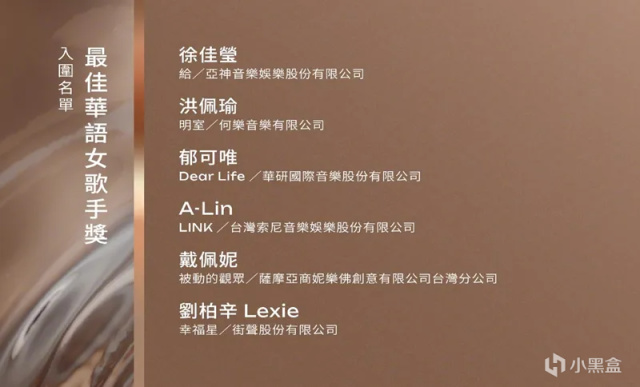 最佳华语女歌手,徐佳莹、洪佩瑜、A-Lin、戴佩妮以及内地歌手郁可唯和刘柏辛入围 !最佳新人奖,洪佩瑜《明室》、黄浩庭《万寿菊》、芒果酱《新.宝岛少年?》、鹤《The Crane:TALENT》、LCY《LCY》、潮州土狗《狗狗历险记》、 阿布丝《ABUS》入围。