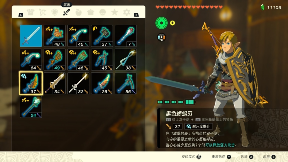 遊戲的武器雖有耐久,但本身是爲了刺激玩家探索和思考,可謂是與遊戲流程環環相扣、引發各種蝴蝶效應,所以該用武器的時候就請盡情慷慨,特別是《王國之淚》的「究極手」能力,通過各種資源的拼裝,簡直把遊戲變爲了《現 代 戰 爭》,其正面反饋幾乎無敵,而一直過於遵守保守的自我限制,會損失遊戲的上限樂趣。