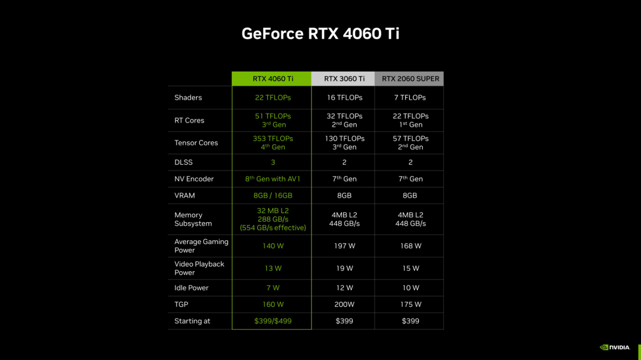 功耗方面,RTX 4060 Ti 显卡的 TGP 功耗为 160W,平均游戏功耗为 140W,闲置功耗为 7W,相比上代 RTX 3060 Ti 明显下降。