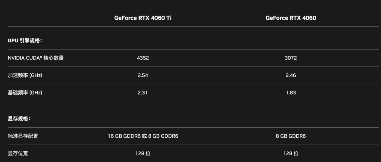 RTX 4060 Ti/ RTX 4060 显卡参数如下: