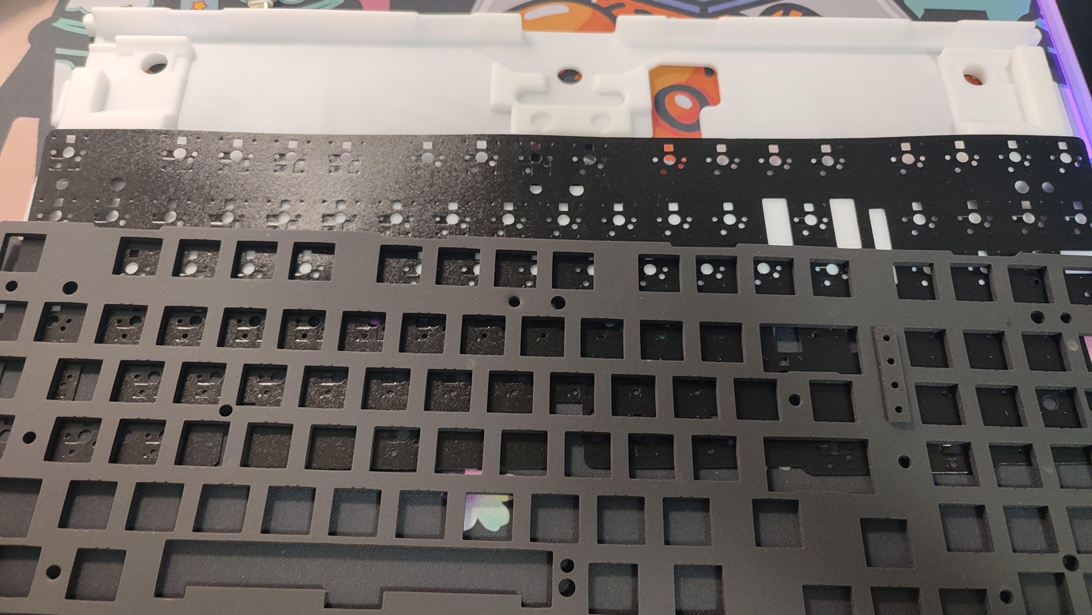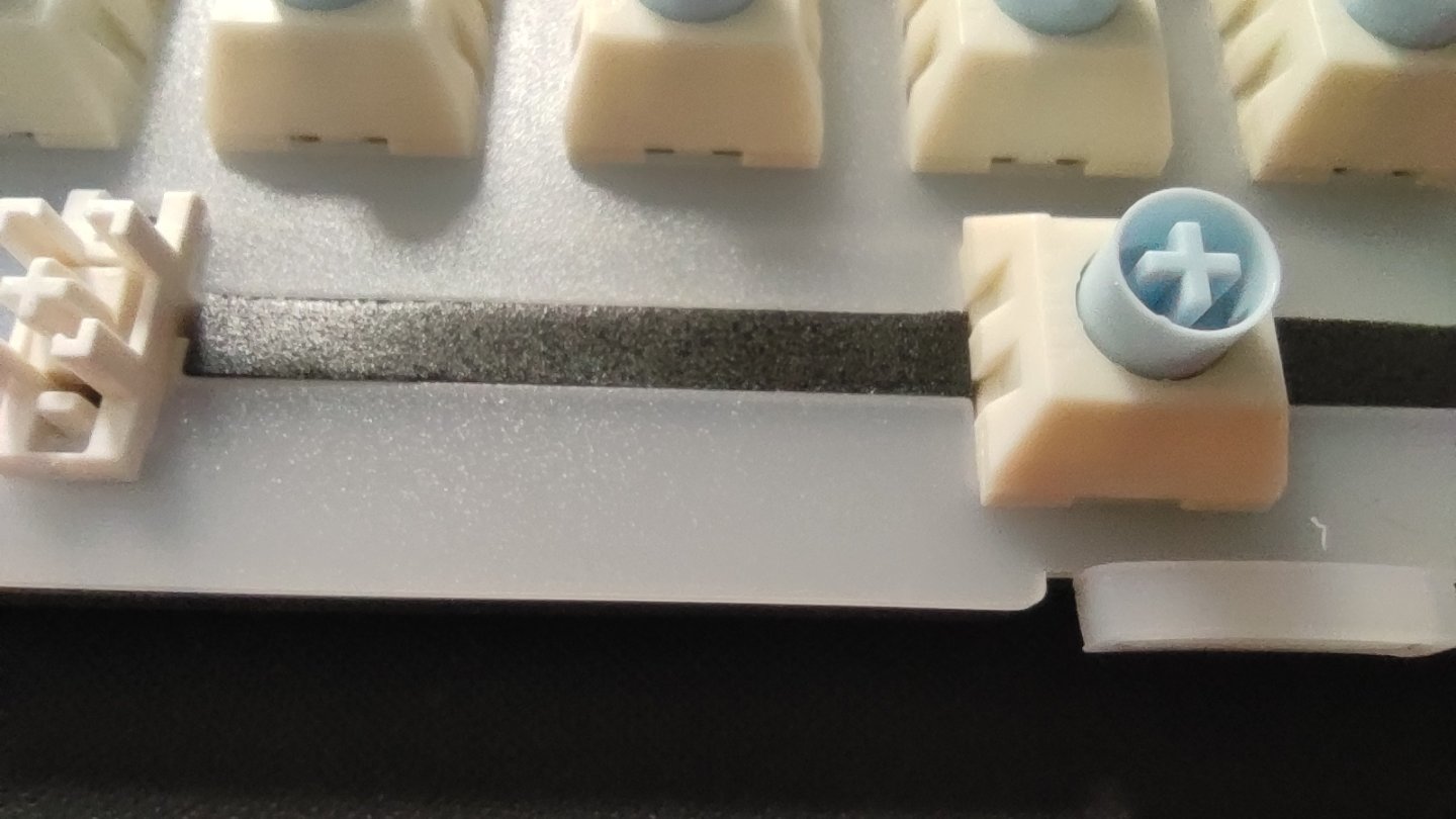 可以看到V98PRO採用的並不是傳統的硅膠三件套或者是PORON三件套,而是將兩者結合起來,硅膠底棉相較於PORON底棉來說,優點是填充程度更加飽滿,不過缺點就是形變程度會比較弱;夾心棉採用PORON棉,透光性相較於硅膠夾心棉來說會稍弱一點,不過優點就是軟彈程度比硅膠好一點。