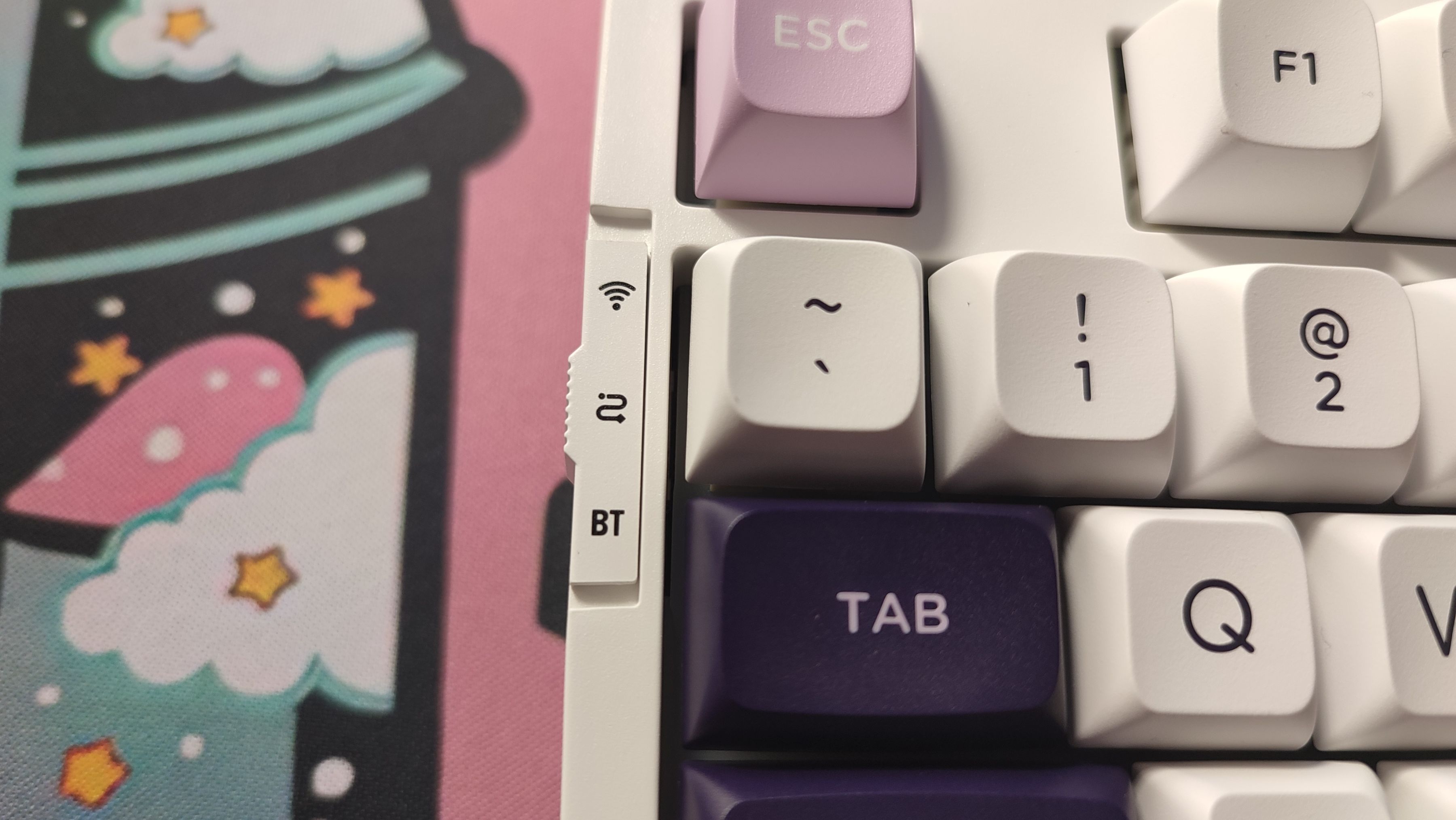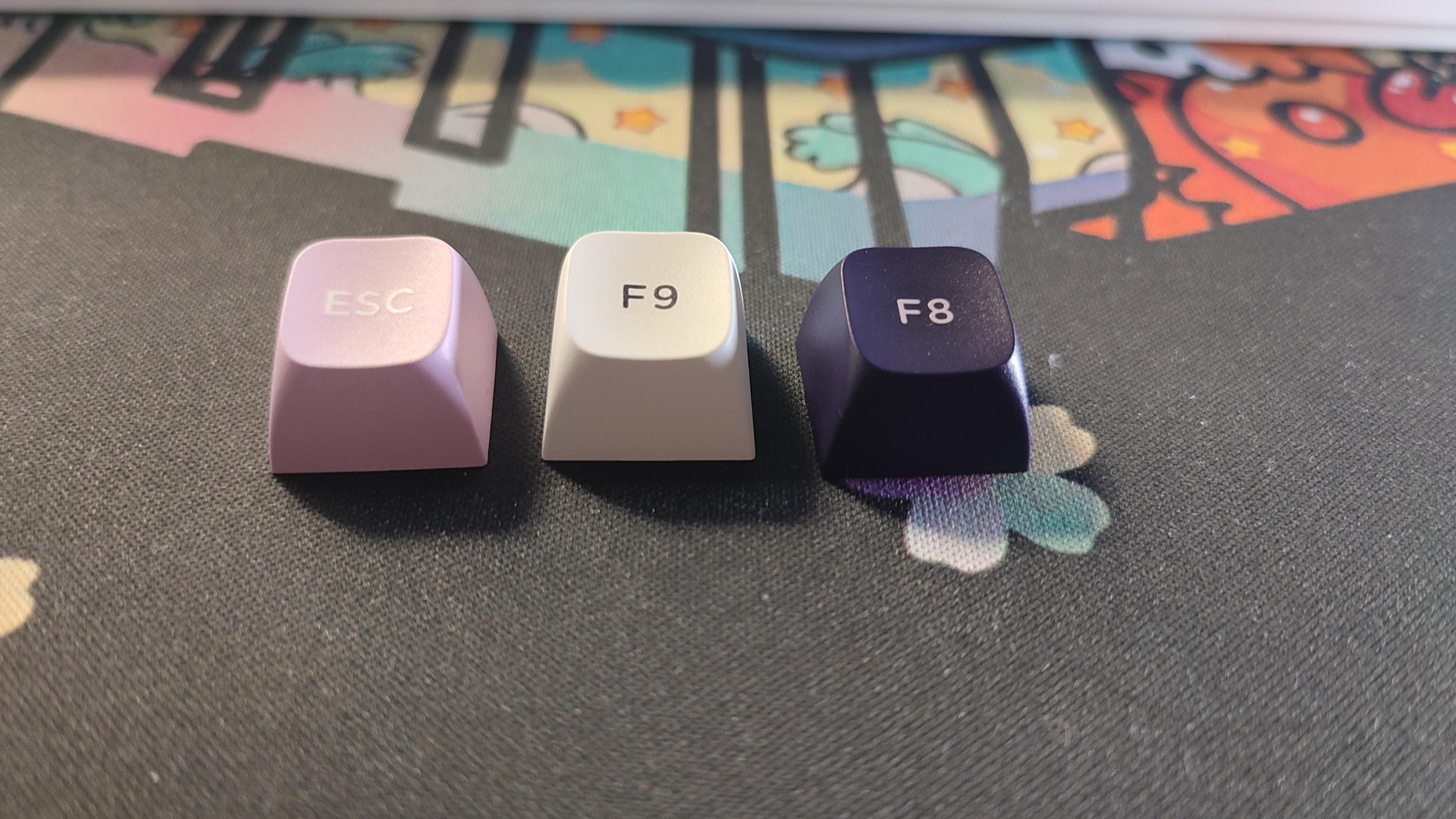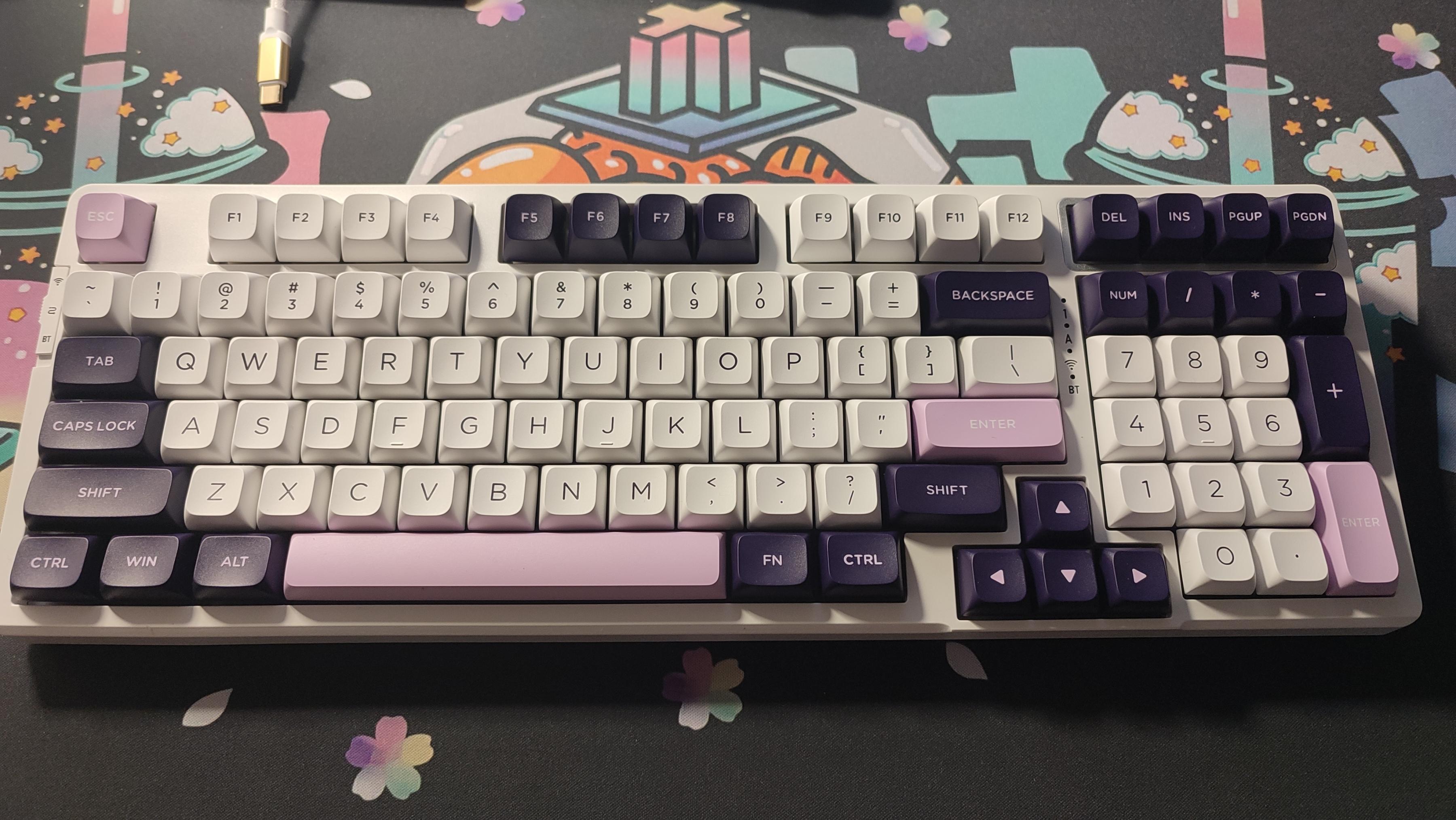 鍵帽整體設計爲三拼色PBT鍵帽,整體採用二色注塑工藝製成,主鍵區爲白色鍵帽,字符爲深紫色,功能鍵以及部分鍵帽採用深紫色,字符爲粉色。以部分粉色鍵帽作爲點綴,白色字符。整體看上去十分優雅。鍵帽高度爲mda,在符合人體工學設計的同時加大了鍵帽與手指指腹之間的接觸面,整體十分圓潤且實用。