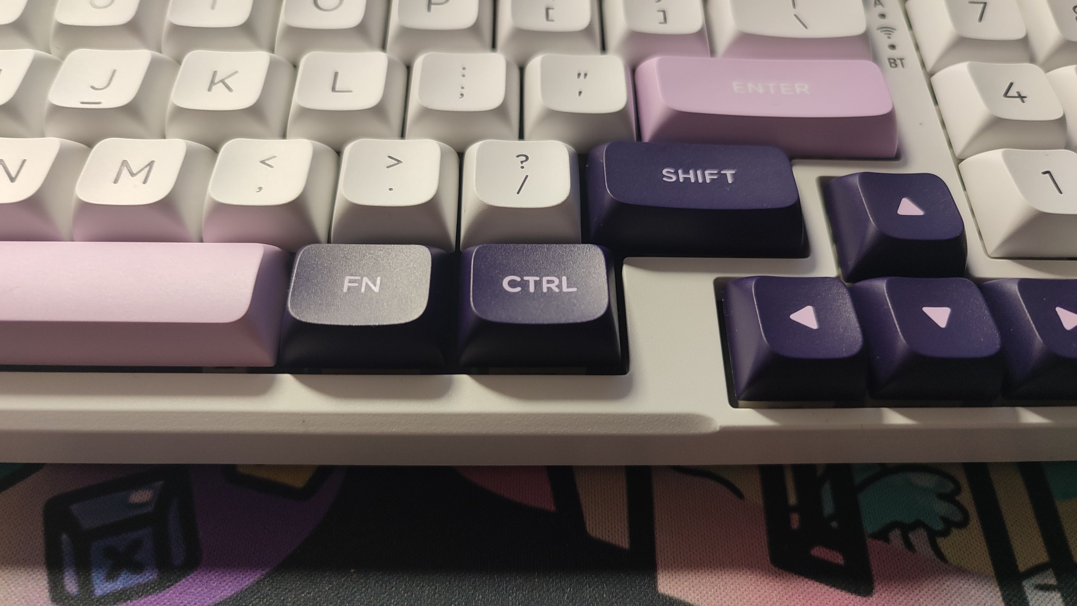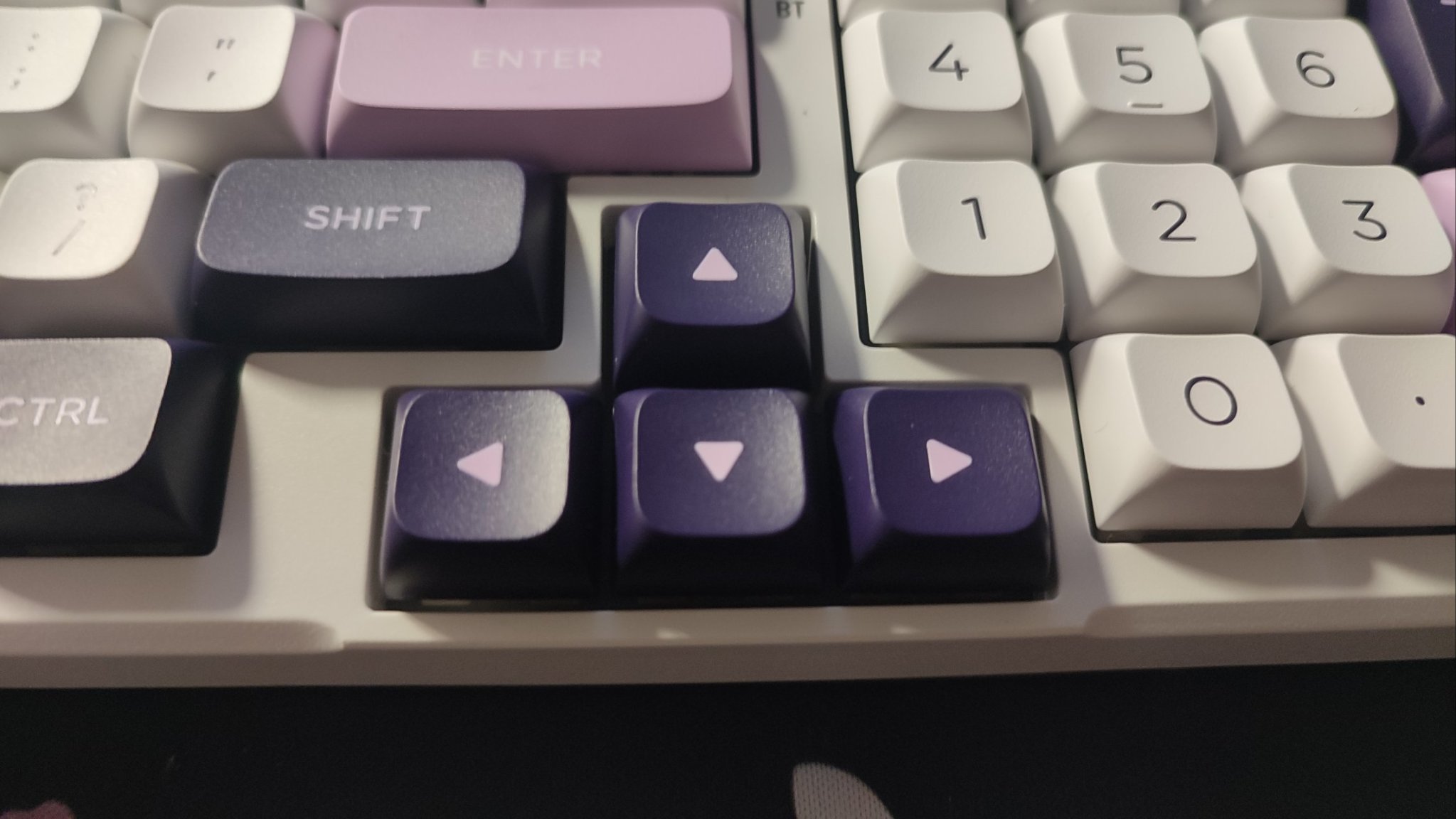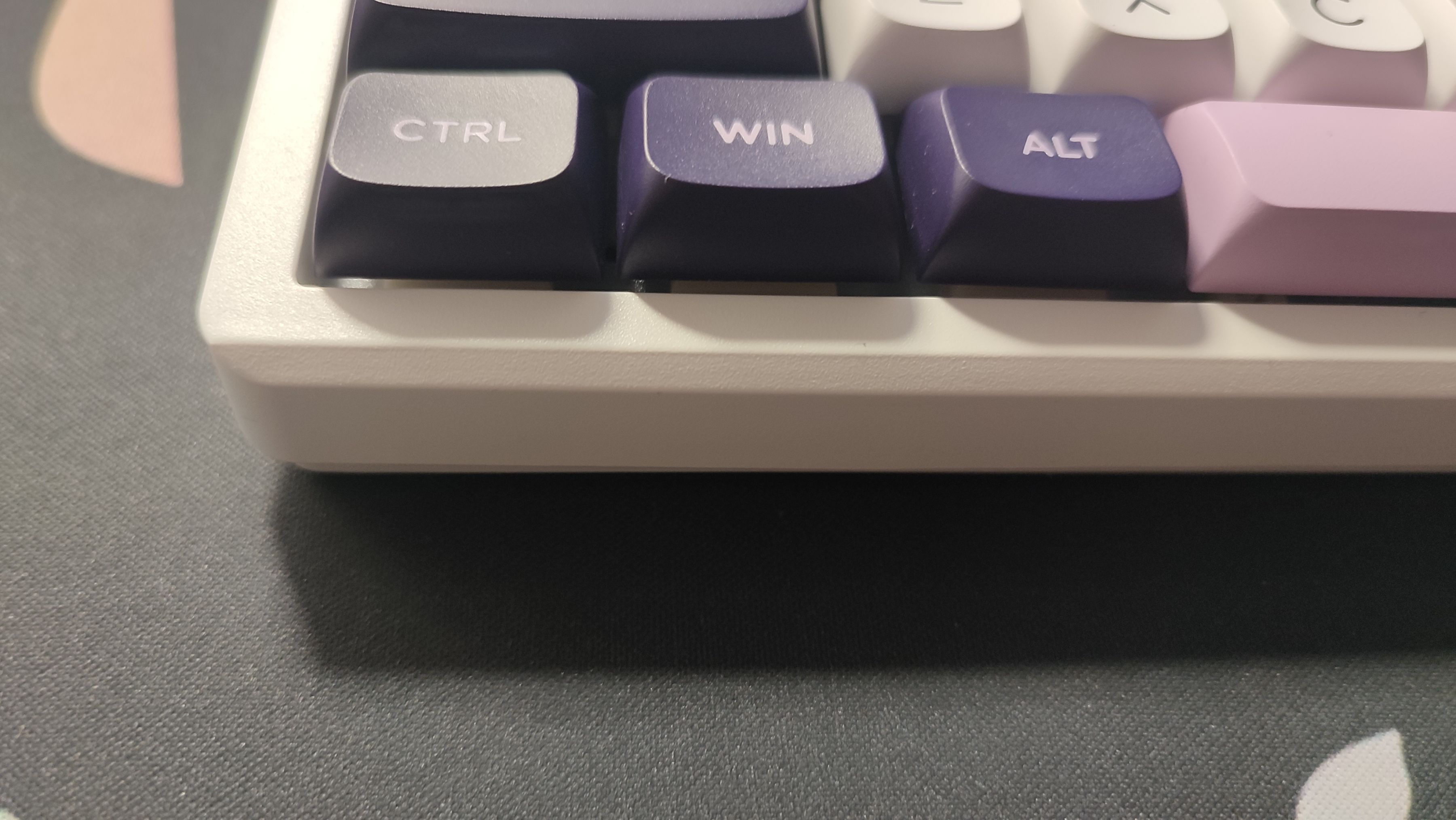 鍵帽整體設計爲三拼色PBT鍵帽,整體採用二色注塑工藝製成,主鍵區爲白色鍵帽,字符爲深紫色,功能鍵以及部分鍵帽採用深紫色,字符爲粉色。以部分粉色鍵帽作爲點綴,白色字符。整體看上去十分優雅。鍵帽高度爲mda,在符合人體工學設計的同時加大了鍵帽與手指指腹之間的接觸面,整體十分圓潤且實用。