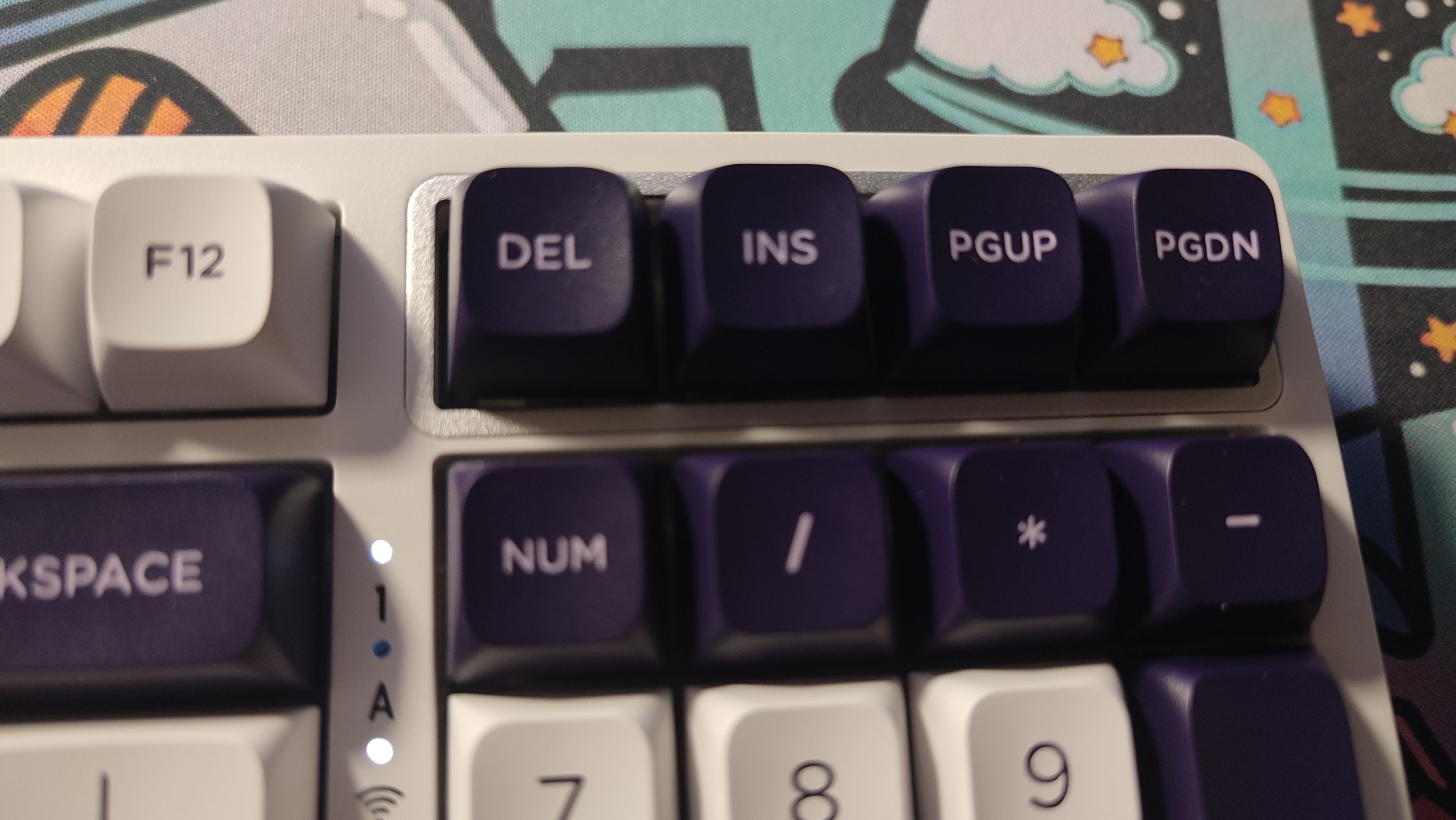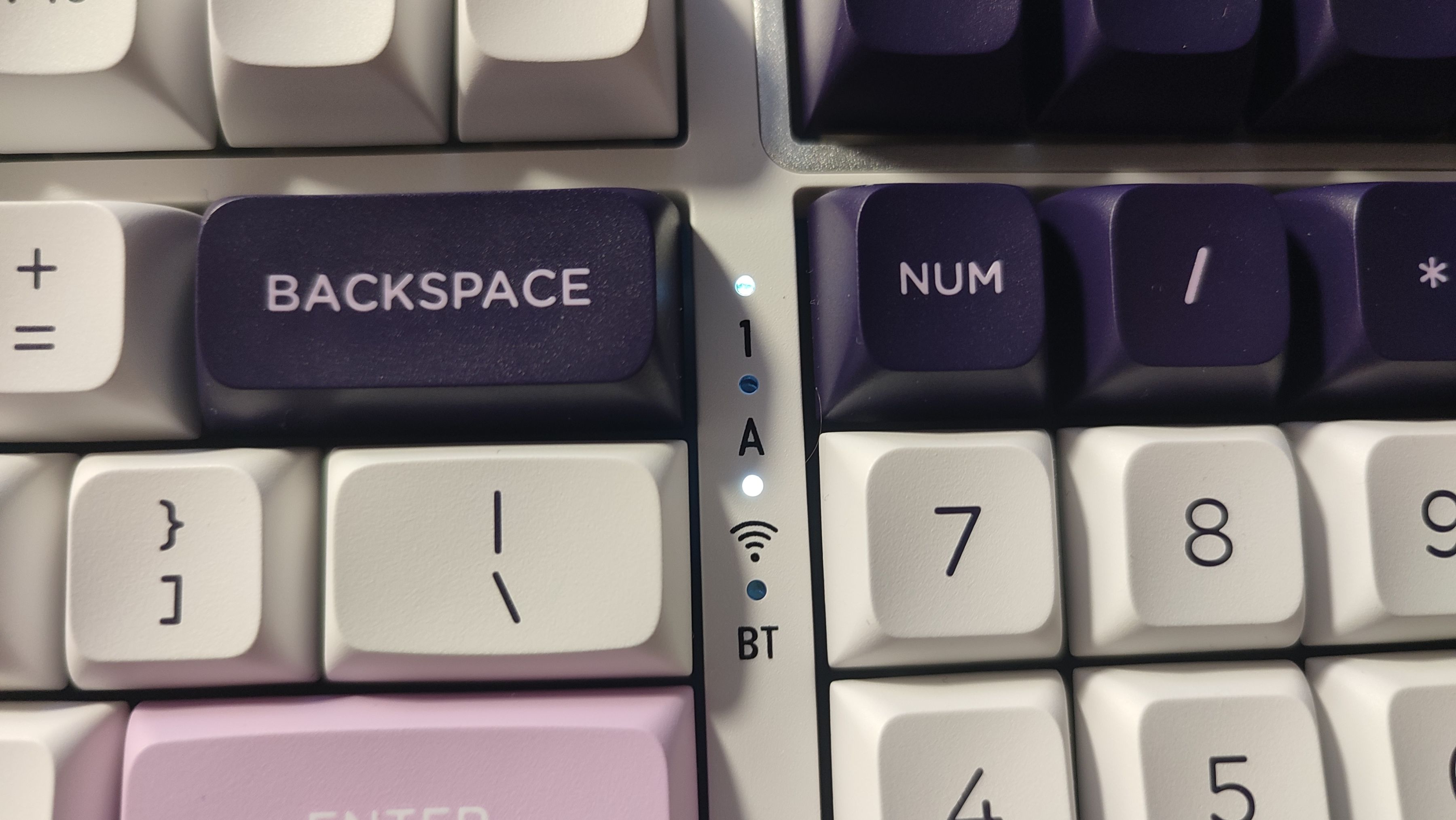 指示燈則在數字區以及主鍵區中間。前幾批鍵盤有指示燈漏光的情況,不過在這麼久以後的批次中,比如我這把,已經沒有漏光的情況了