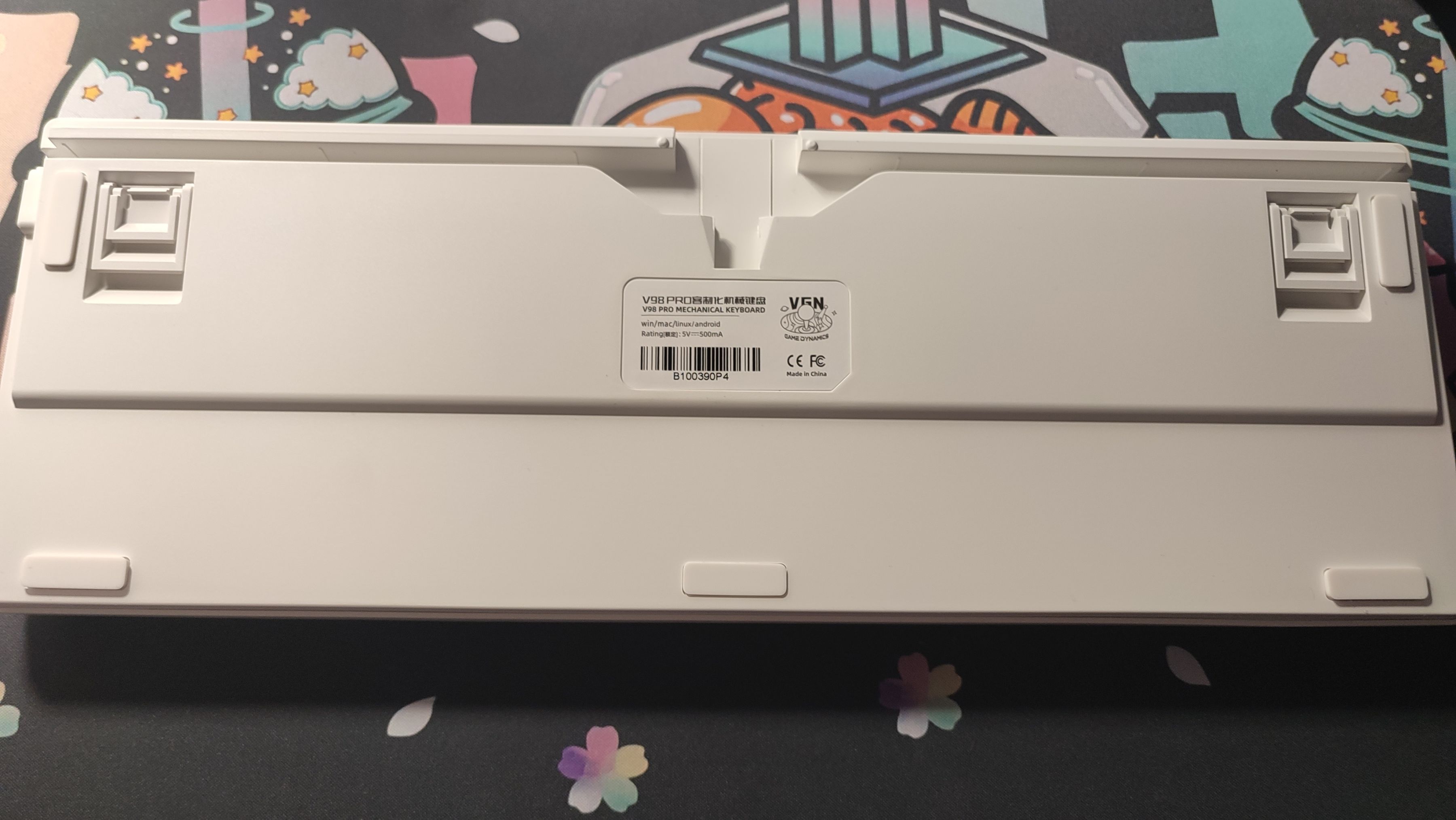 背面能看到中間有一個同色貼紙,記錄了一些鍵盤的基礎信息,四周是五個防滑貼以及二段式腳撐。