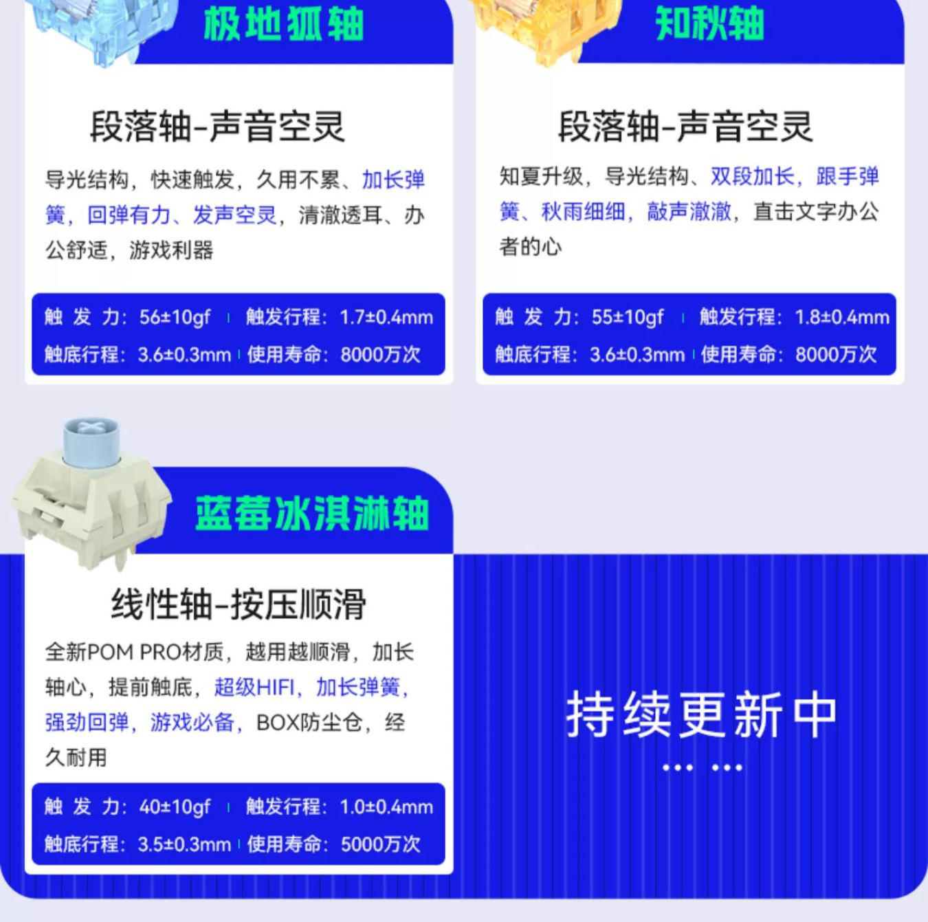 其中冰淇淋pro軸爲類紅軸體,常規壓力,觸發稍微提前了一點點但不太多;藍莓冰淇淋軸爲類銀軸體,基本可以看作冰淇淋PRO類銀版本;冰莓冰淇淋軸和藍莓冰淇淋軸的區別僅在於配色,除此之外一樣。