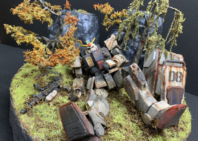 第二款模型使用的是08小隊中的陸戰高達模型進行鞭炮戰損製作。同樣是用鞭炮將高達模型進行捆綁和燃放,然後對模型進行回收和一些細節的補色,再搭配上場景地臺,一款比較帥氣的戰損高達模型就製作完成了。模友製作的兩款模型除了鞭炮戰損外,在回收模型後還進行了舊化補色,所以呈現出來的效果比較不錯,普通的鞭炮戰損是無法呈現出以上佳作的效果哦!