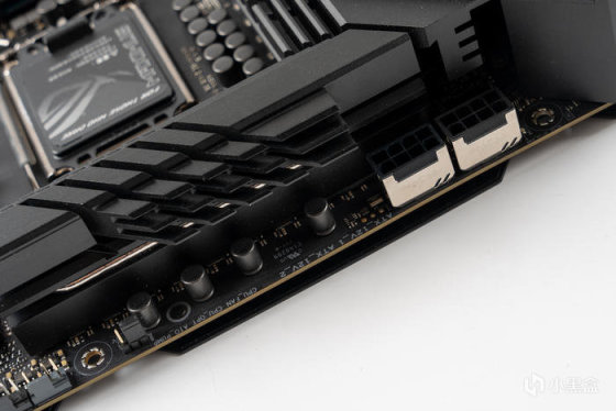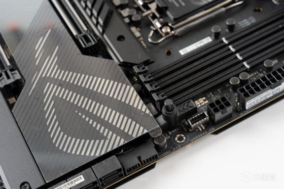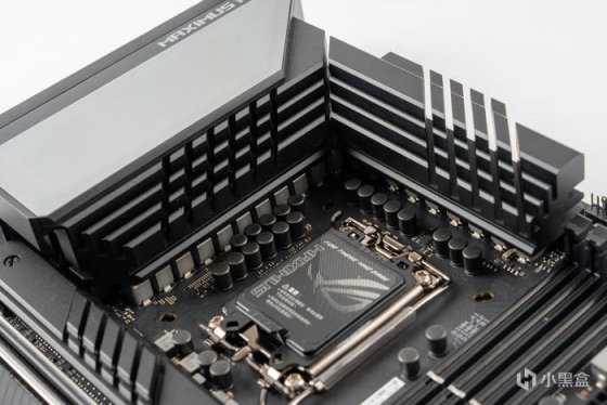 20+1(90A)的核心供电以及这两块高高层叠的散热切割设计,中间具有热管连接和高效导热垫,保证了Z790HERO的超频能力