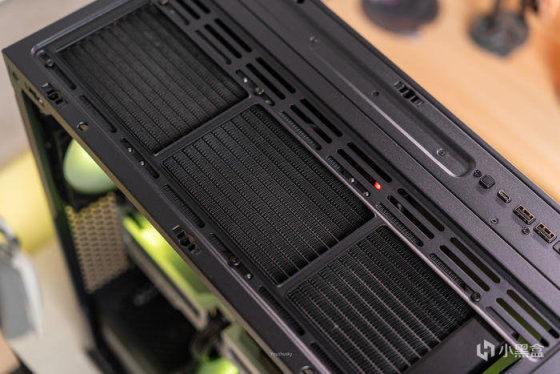 顶部面板为碰珠结构,抬起即可打开,内部有磁吸防尘网,下面是九州风神LT720冰魔方的冷排