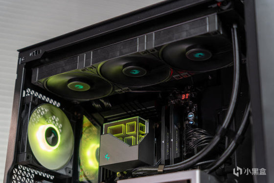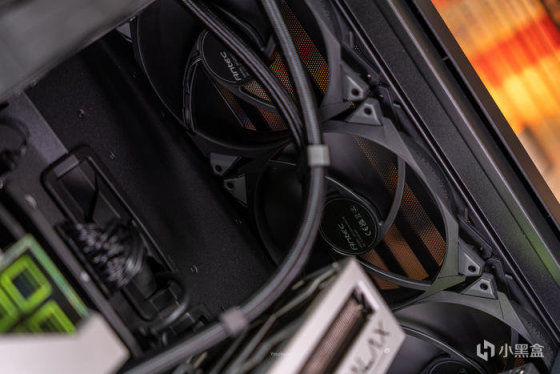 前面板冷排架上自带的三把14030规格的安钛克STORM T3 风扇,风量大风压足