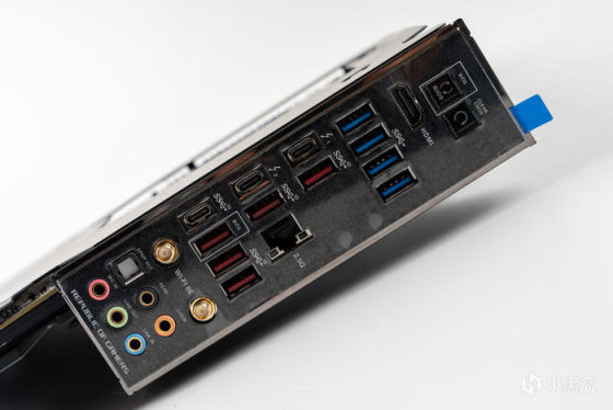 主板背部的接口依次是清除CMOS、BIOS刷写按钮、集显HDMI、四个蓝色USB3.2GEN1、五个红色USB3.2GEN2、两个40G雷电四、一个type-C、2.5G有线和WIFI6E无线以及镀金音频接口