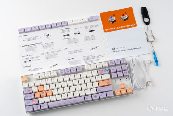 键盘包装内的全家福,除了键盘本体还有增配的MAC键帽和赠送键,拔键器和拔轴器也是必不可少,配置的90°type-C也不错,还有一张说明书简洁明了各个功能使用方法