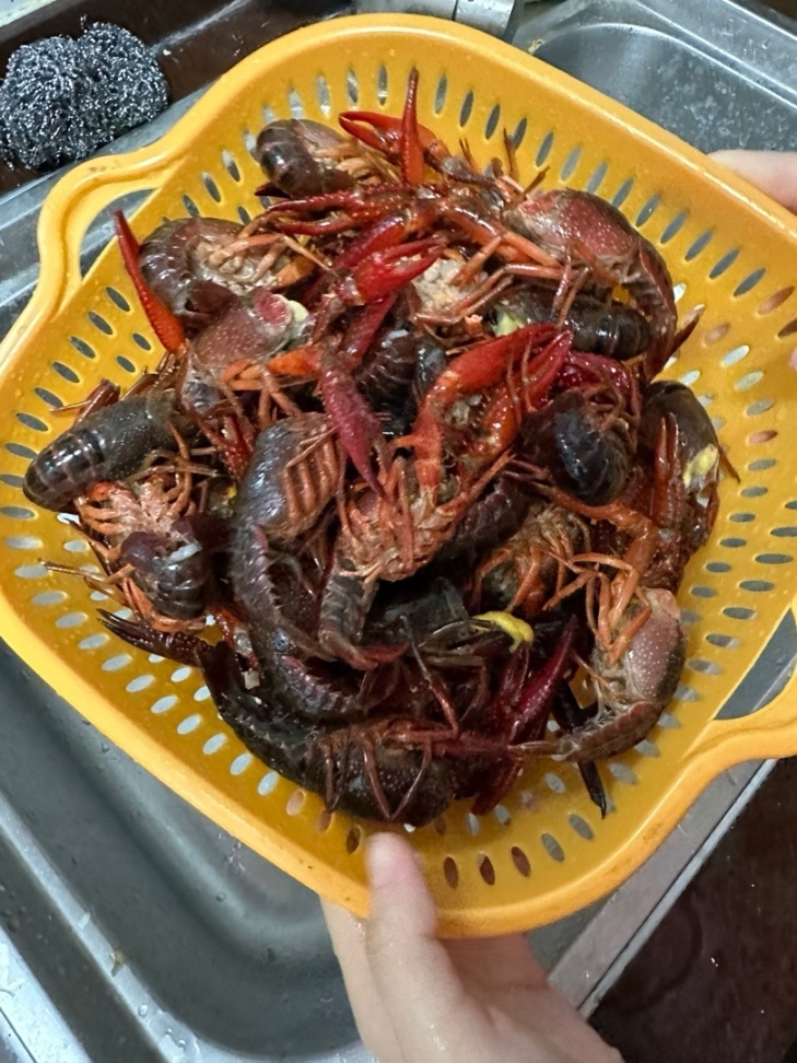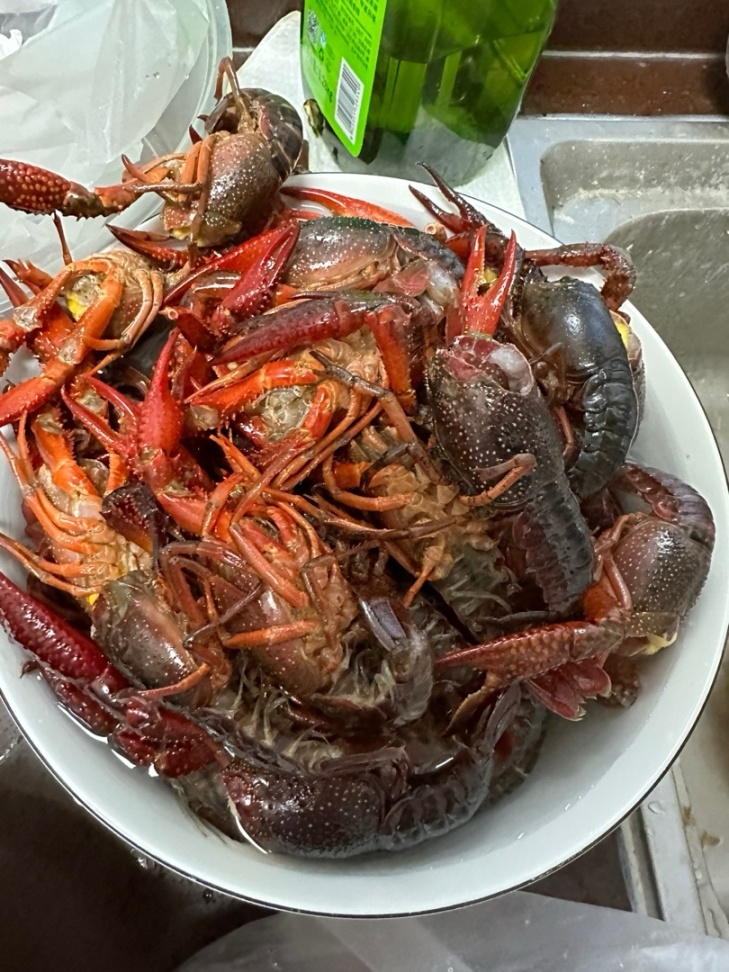 准备食材:新鲜小龙虾,葱姜蒜,小米辣,黄瓜,土豆,笋片(配菜可以加自己喜欢吃的,还有主食可以加)八角,桂皮,香叶,火锅底料,郫县豆瓣酱,啤酒。(是有点多哈)