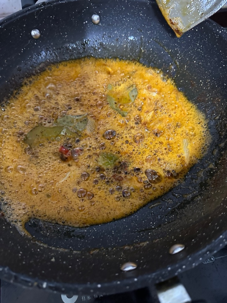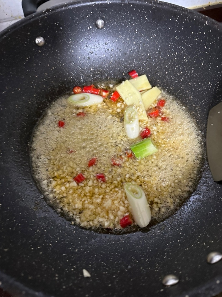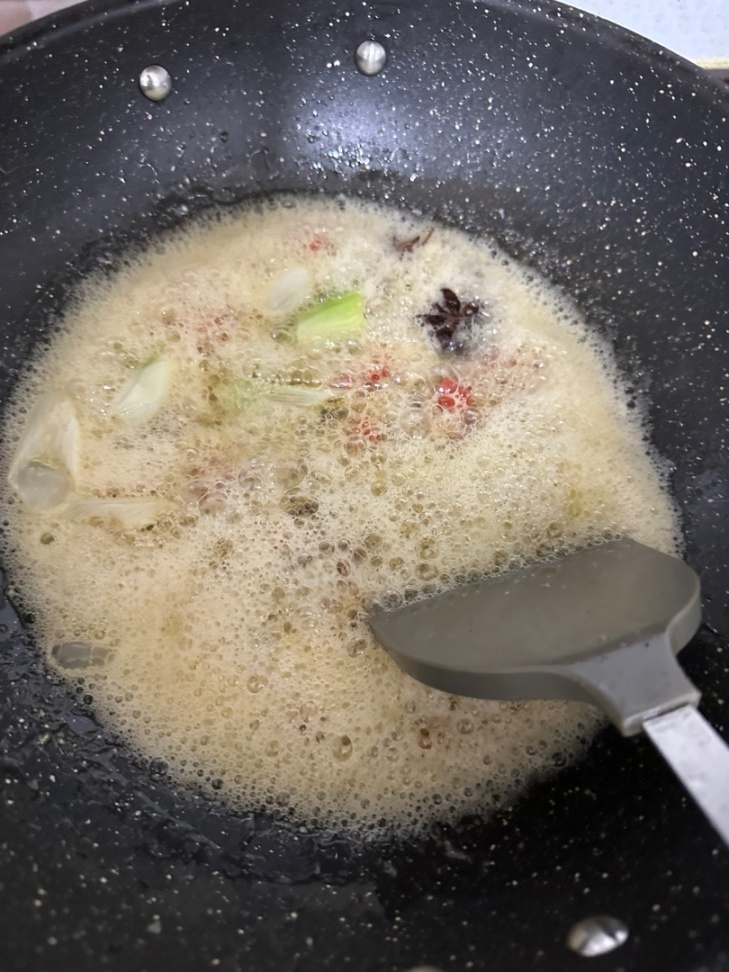 3.炸完虾的油放入葱姜蒜炒到微香放入红辣椒、八角、青麻椒、红花椒、香叶、桂皮再次炒香,放入豆瓣酱炒出红油、放入龙虾调料(火锅底料)