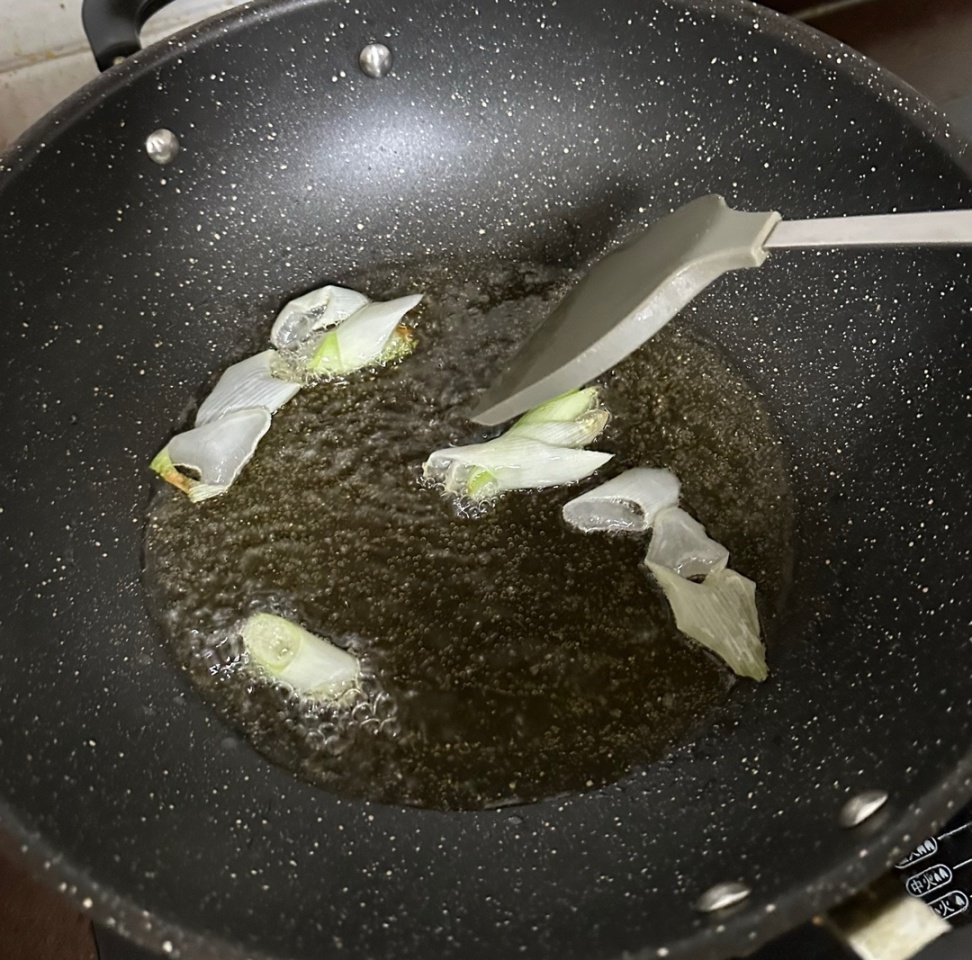 2.把黄瓜铺在碗底,锅中倒油烧热至把放葱进锅中之后起沫,放入龙虾,炸至表面金黄(两三分钟即可)捞出备用