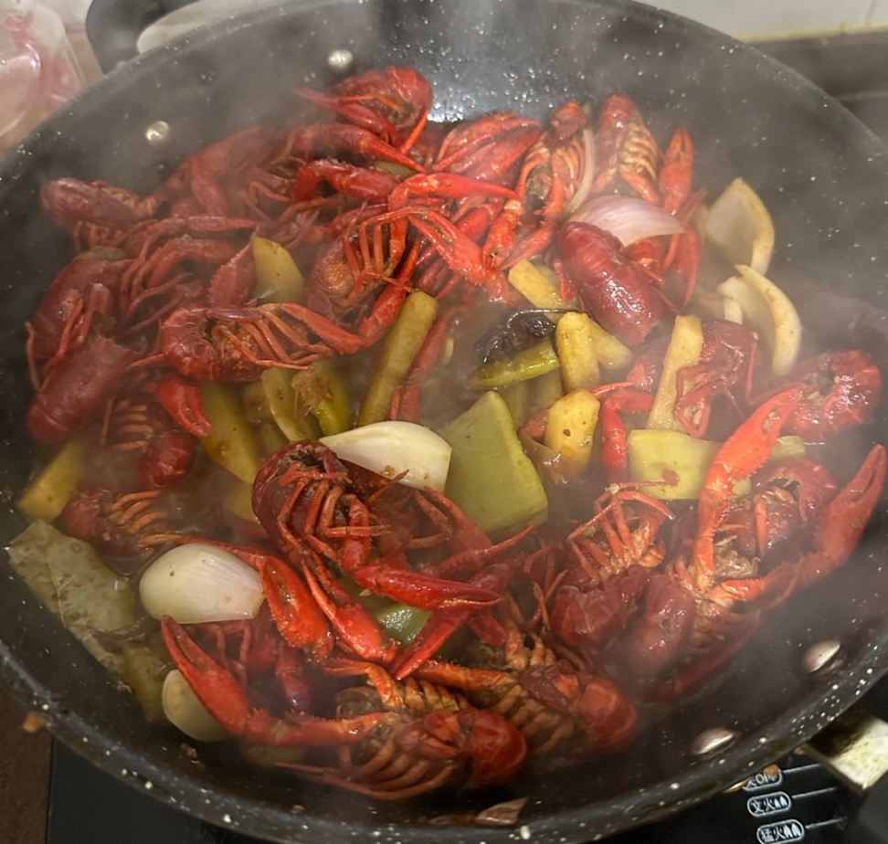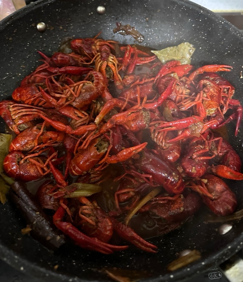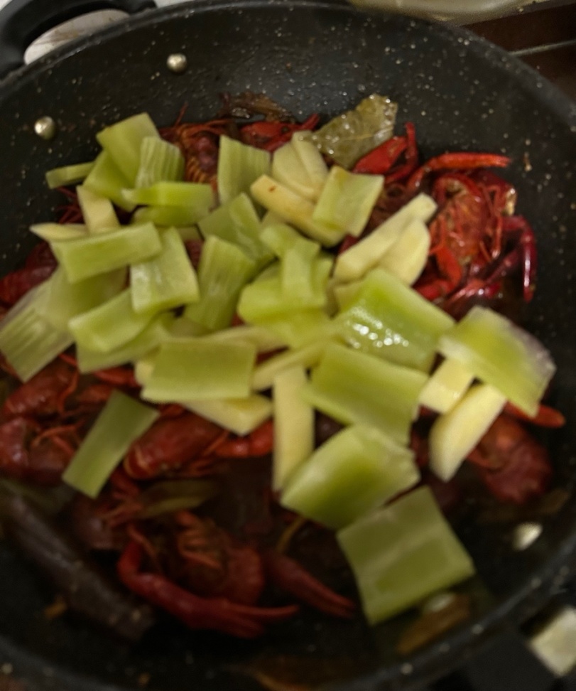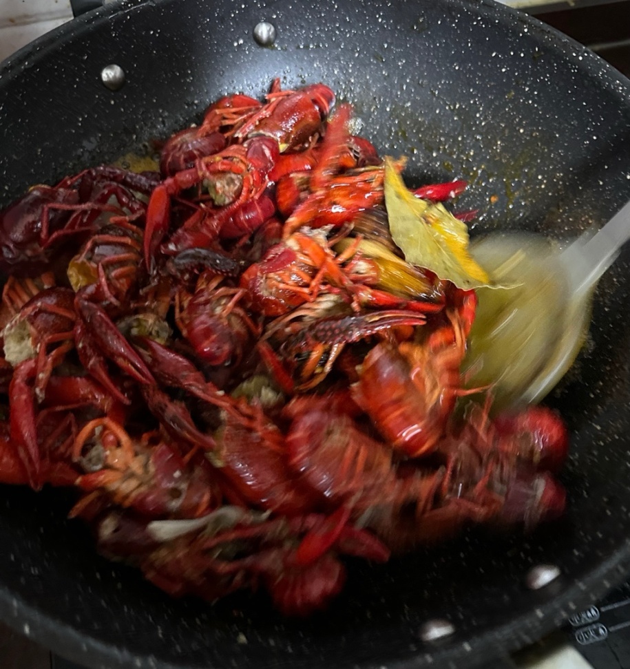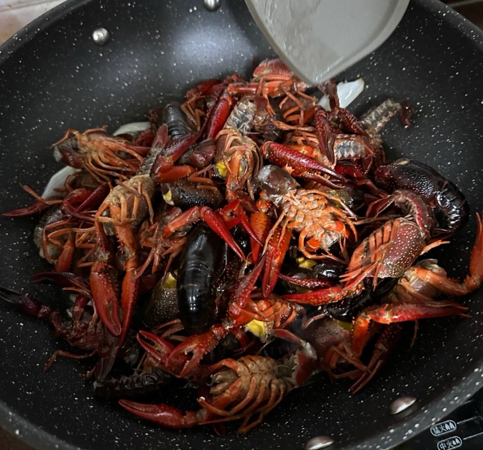 4.倒入炸好的龙虾,翻炒均匀,倒入一瓶啤酒,放(盐、鸡精、蚝油、十三香、生抽、老抽、白砂糖)(喜欢淡一点口味的,这些可以不放,火锅底料豆瓣酱里覆盖了,我是重口的,所以放多了一点)盖上锅盖大火煮开后大概五六分钟放入配菜(随个人喜好)煮两分钟后出锅,加入香菜(不喜欢吃可以不加)和白芝麻就可以炫了