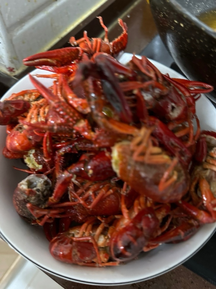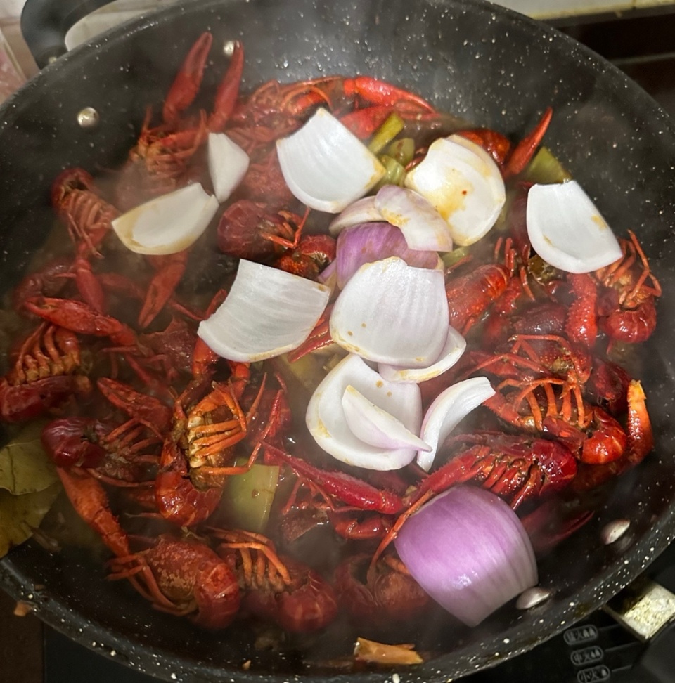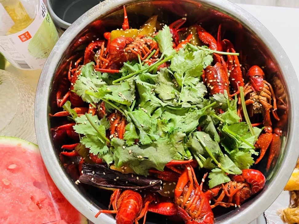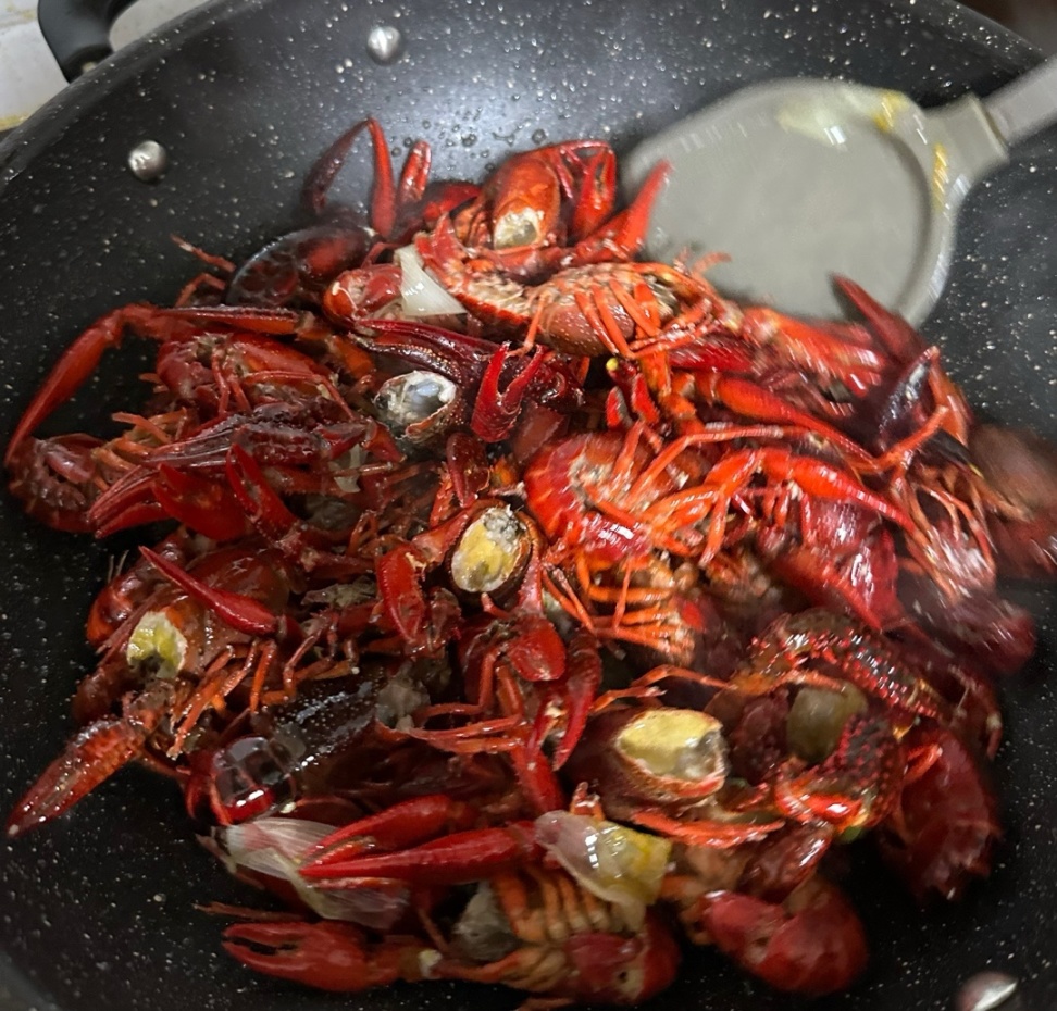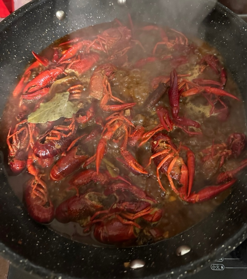 4.倒入炸好的龙虾,翻炒均匀,倒入一瓶啤酒,放(盐、鸡精、蚝油、十三香、生抽、老抽、白砂糖)(喜欢淡一点口味的,这些可以不放,火锅底料豆瓣酱里覆盖了,我是重口的,所以放多了一点)盖上锅盖大火煮开后大概五六分钟放入配菜(随个人喜好)煮两分钟后出锅,加入香菜(不喜欢吃可以不加)和白芝麻就可以炫了