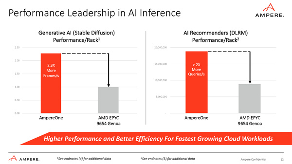 二是對比AI性能,Stable Diffusion、DLRM兩個項目,號稱相比AMD霄龍9654分別領先2.3倍、2倍。