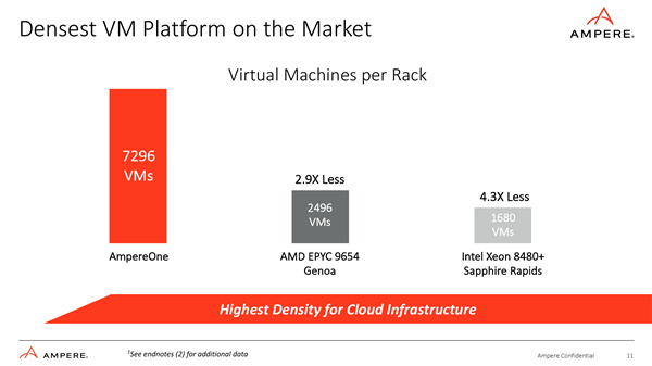 一是對比支持的虛擬機數量,42U 16.5千瓦機架空間內,AmpereOne可多達7296個,AMD霄龍9654 Genoa、Intel至強8480+ Sapphire Rapids則分別只有2496個、1680個。