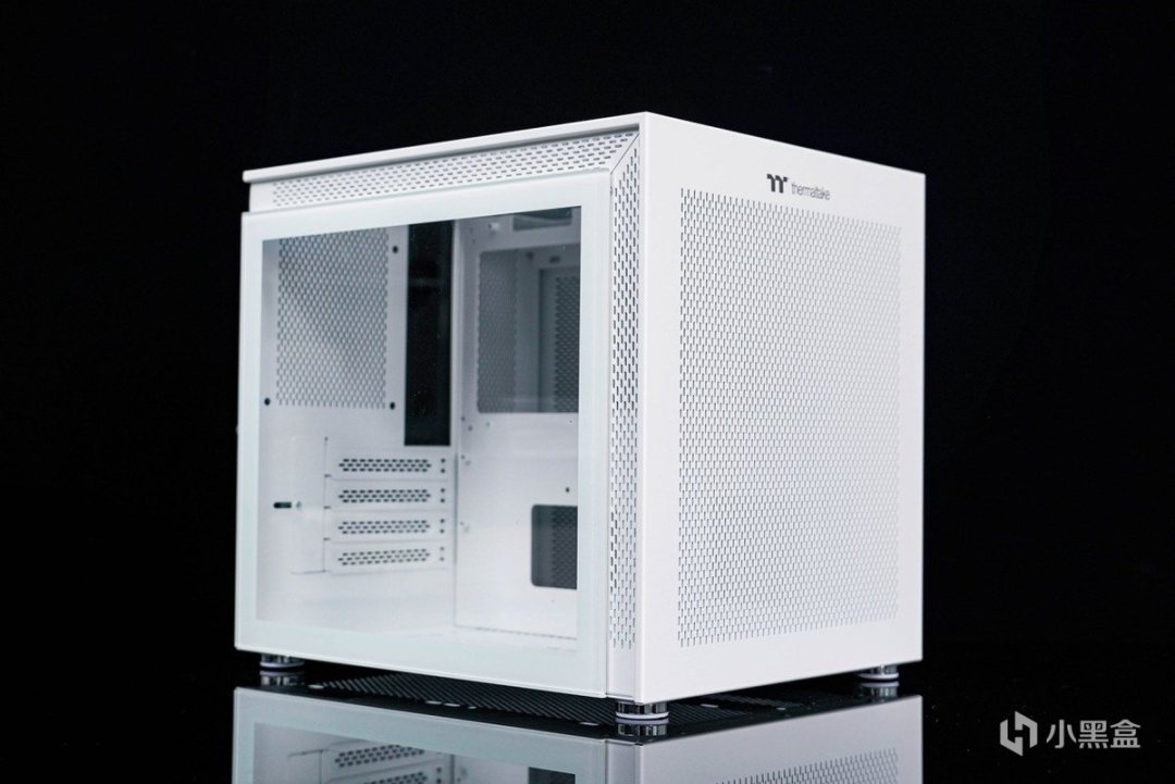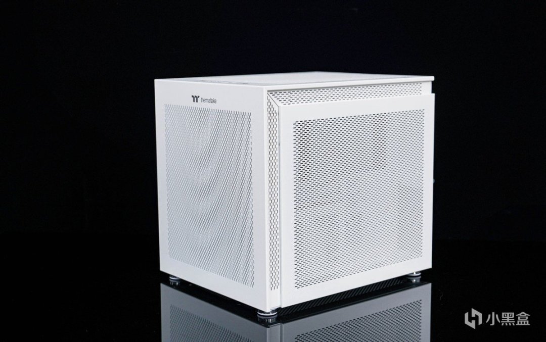 机箱外观则采用除了左侧面玻璃板部分之外几乎全网孔包裹的正方形设计,机箱尺寸为337x265x305mm,体积约为27L,机箱体积相比普通M-ATX机箱小了不少,比较适合放在桌面,这款机箱唯一不便捷的地方就是开机按键放置在上置,要是放置在前置面板下放那就更加不错了。机箱有双色可选(白色和钛灰),机箱前面板不可拆卸,有大面积散热网孔,形状并不是常见圆形,而是竖直排列圆角矩形,前面板上方还印有Tt的Logo与全称。