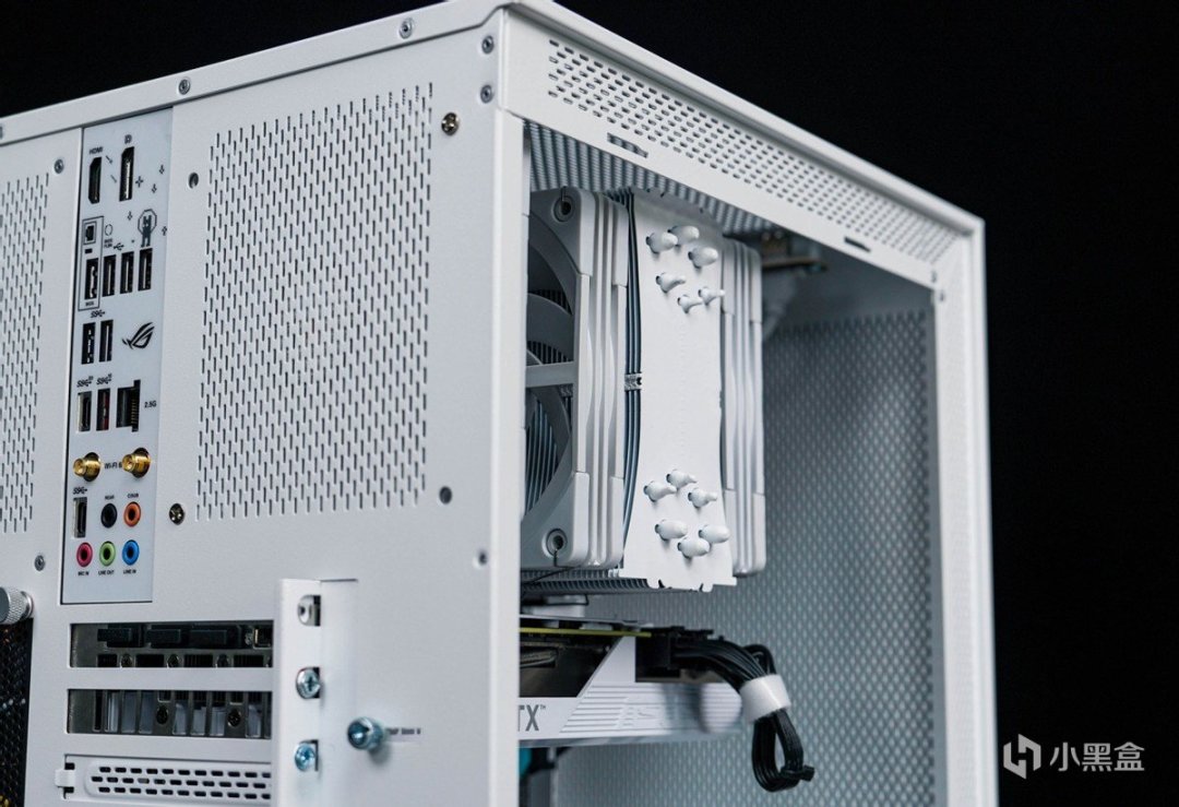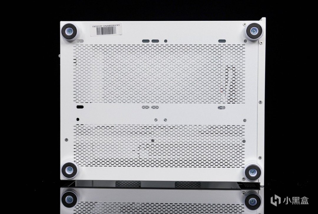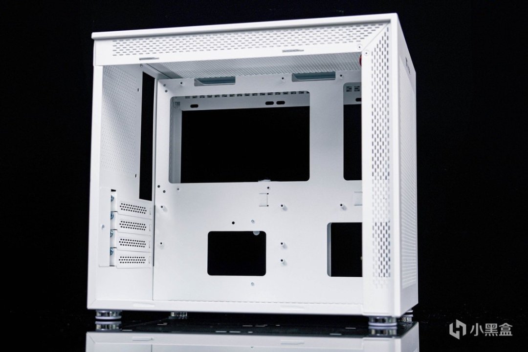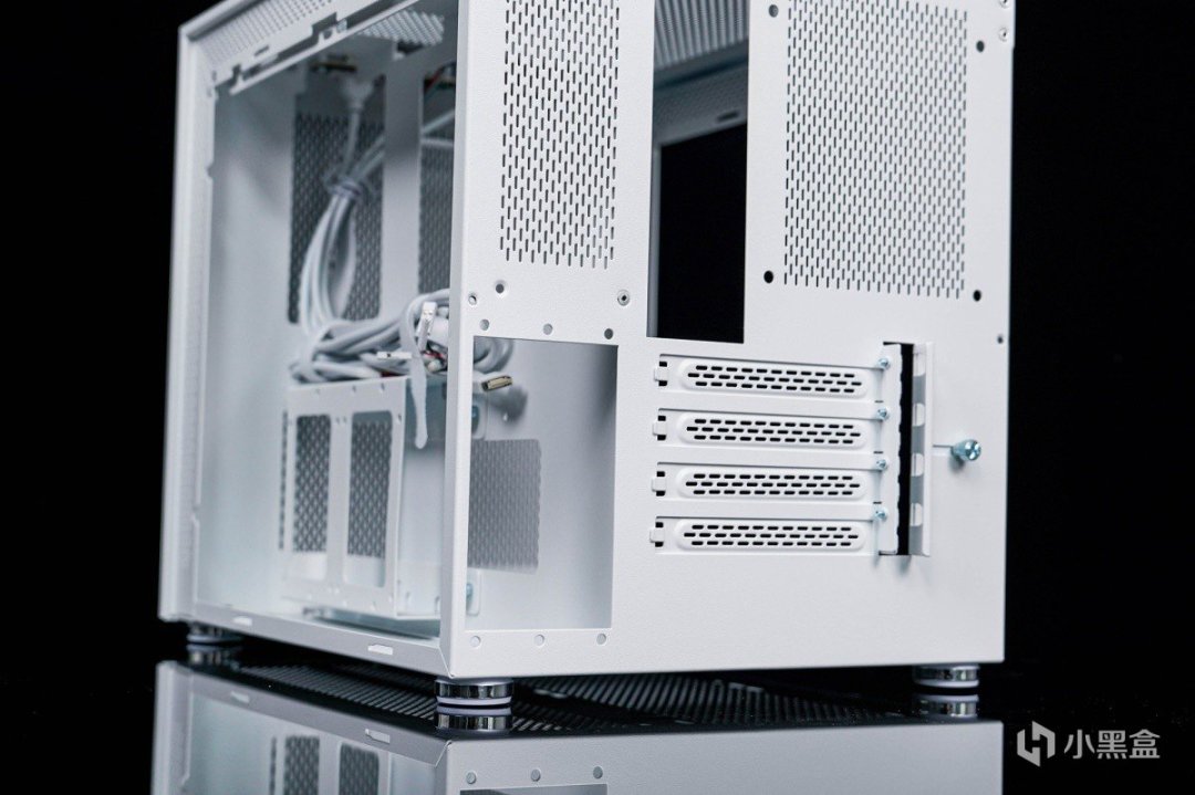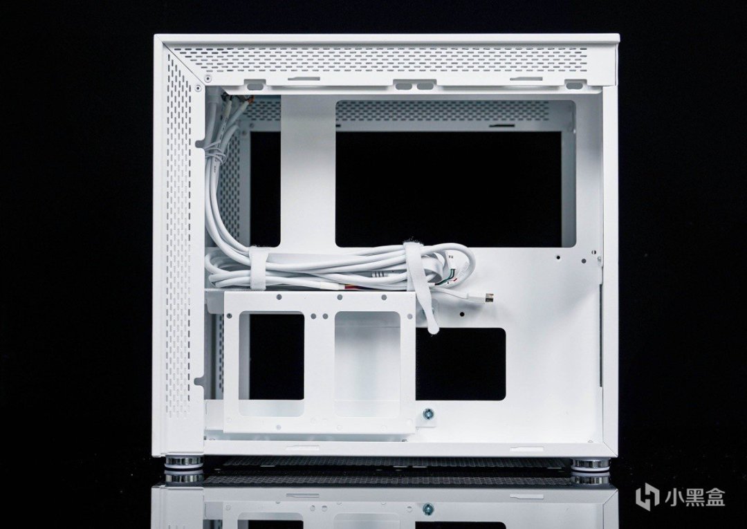 再来看下右仓,可以后仓各区域的划分情况。I/O面板的线材同样为白色,契合机箱颜色,通过魔术贴固定。通过机箱附赠的支架,上方可以安装两个120mm风扇或240冷排,加上左仓底部也可安装240冷排,机箱可以同时安装两个240冷排。右下角为电源安装位,仅支持SFX规格电源是个小遗憾。但是左右分仓的设计会让机箱更宽,毕竟多出来的右仓需要安装有一定厚度的电源,仅支持SFX规格电源可能是出于这方面的考虑,尽可能减小电源尺寸,也能让机箱体积更小。左下方为硬盘支架,取下支架右侧的两颗手拧螺丝即可拆卸硬盘支架,可安装两个3.5英寸硬盘或单个3.5英寸硬盘加两个2.5英寸硬盘。安装时可以把硬盘支架拆卸了这样会让整个装机更为方便。