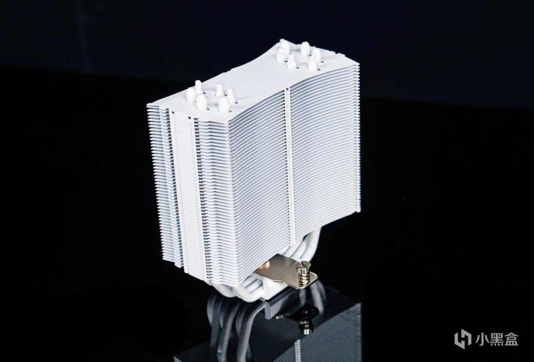 高能效的风冷依然是现如今水冷普及遍地开花的年代,风冷依然是装机不可替代硬件之一。这次CPU散热使用的是利民U120EX REV.4 WHITE,六热管的单塔布局,致敬老旗舰U120E。本体全部为黑色设计,侧面看风扇位都有带弧度的降噪设计,除了铜底带镀镍工艺,六根六毫米热管为回流焊。侧面看散热器为“歪脖子”设计,单塔散热当然要设计不档内存,而空气解构学的鳍片设计能倾斜导风。