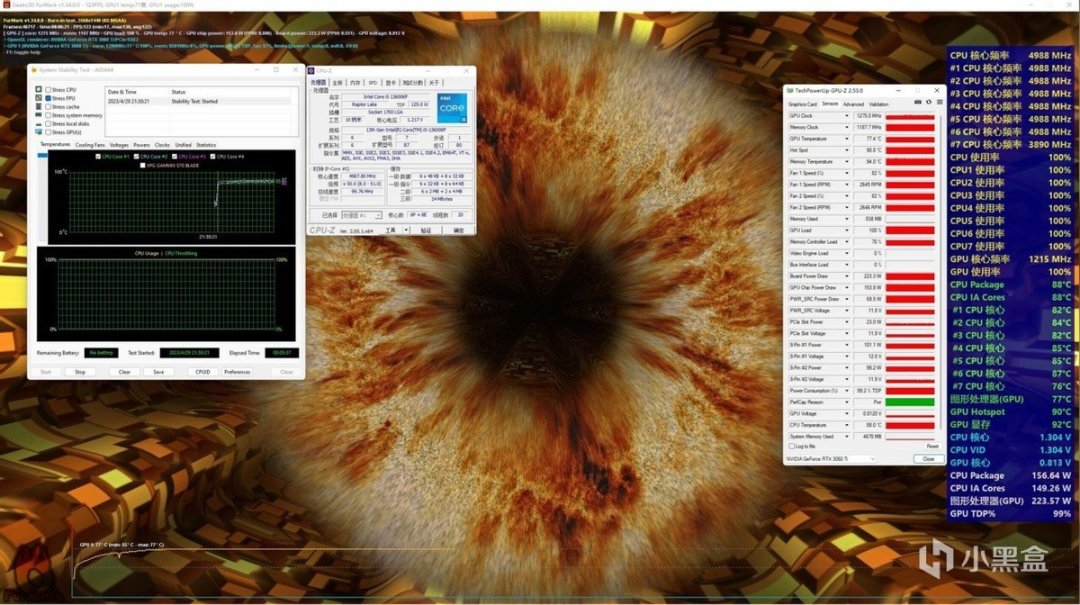 GPU方面,同样进行的是双烤时得出的满载数据,这时候CPU温度比单烤高了2℃,GPU满载瓦数223.5W,GPU使用率100%,GPU温度77℃,热点温度维持在90℃,显存温度在92℃。