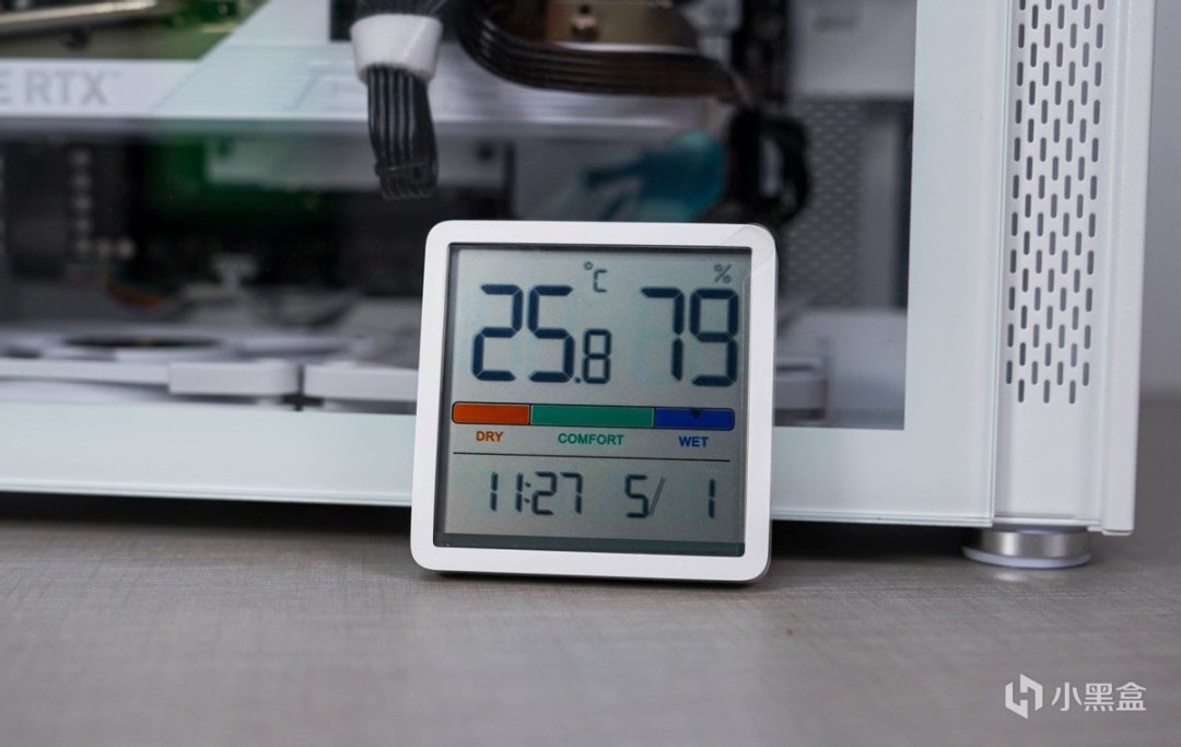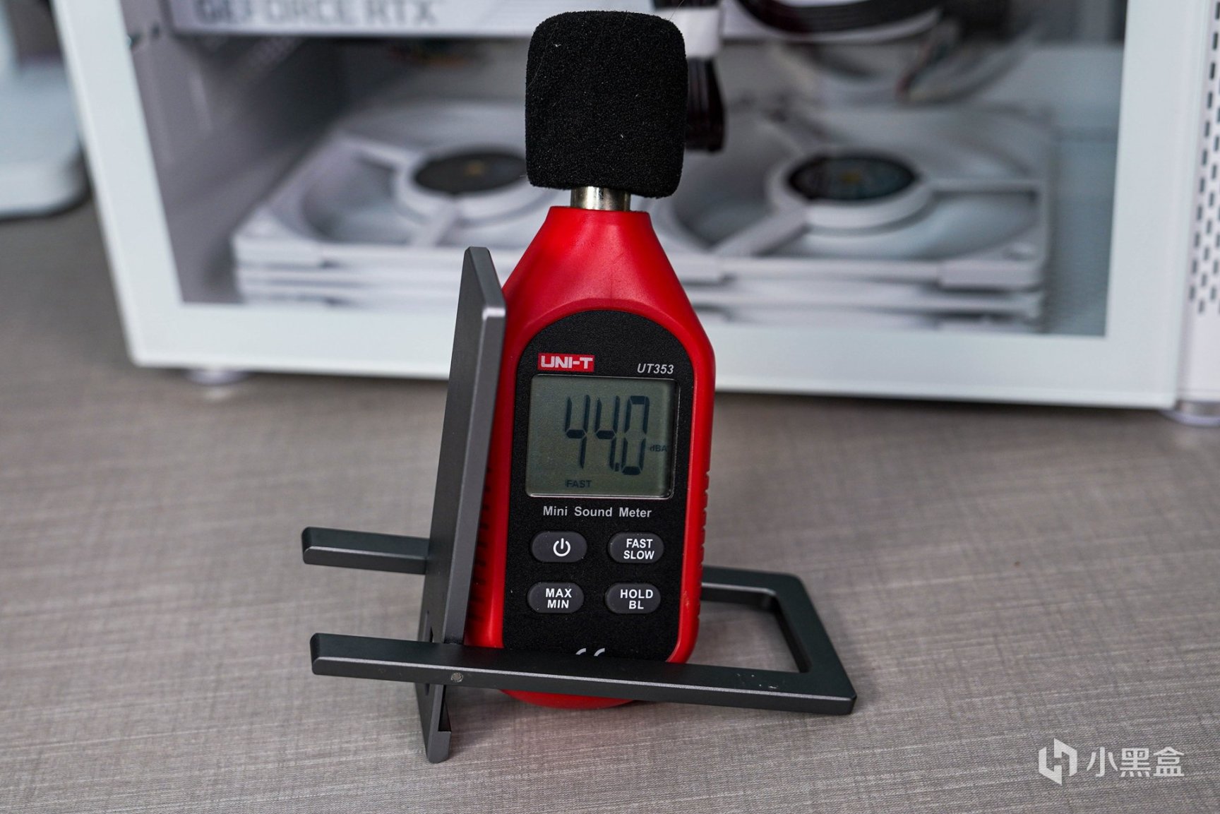 在运行游戏性能评估测试时,也抽空来测了一下整套主机的运行音噪,整个主机在闭合左侧玻璃运行时的噪音维持在44~48分贝之间。通过测噪音仪器的记录,日常使用时可以保持在一个低噪环境下使用这台主机。