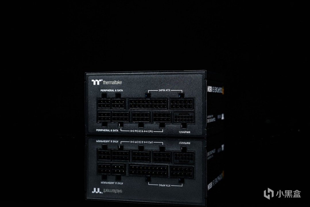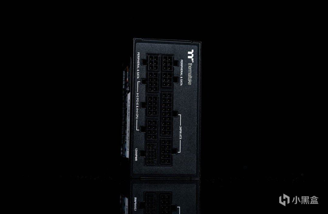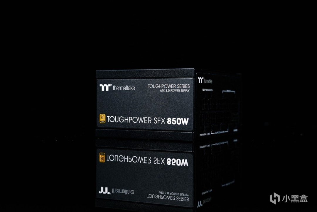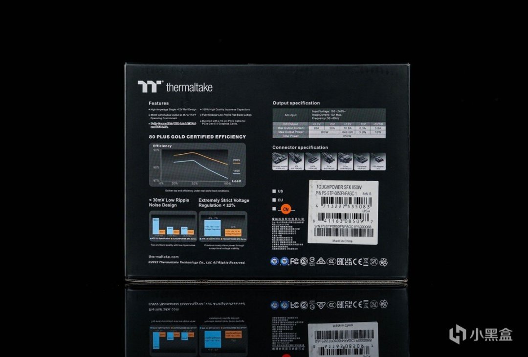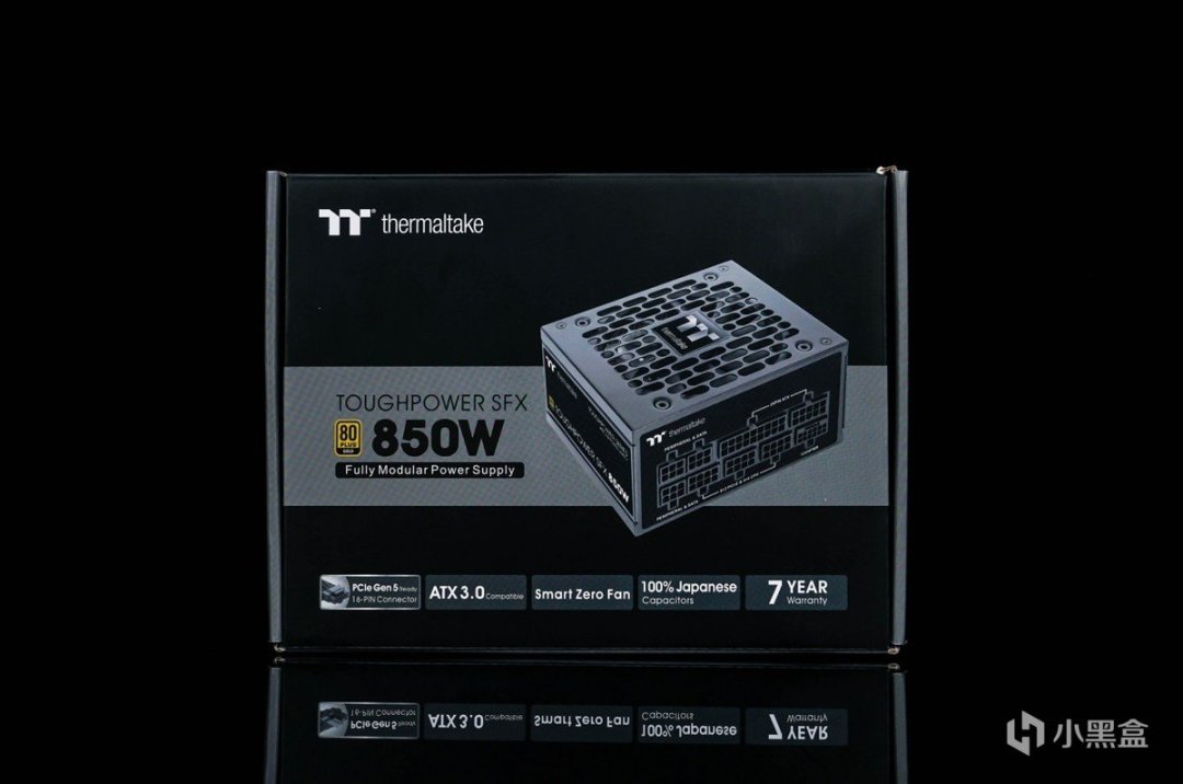 电源方面,考虑到后续要是升级更换机箱和新规格供电接口显卡的话,还是选择ATX3.0电源“战未来”比较合适。市面在售的ATX3.0规格的SFX电源暂时还是较少,而这次上手了Thermaltake 曜越钢影Toughpower SFX 850W金牌ATX3.0全模组电源,外盒正面标注了钢影SFX 850W、ATX3.0、低滤波噪音、80Plus金牌认证、100%全日系电容,7年换新。