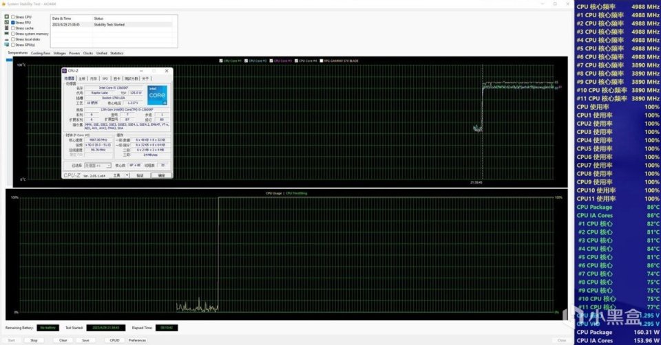 CPU满载5.0G,CPU功耗160W,CPU和核心温度均维持在86℃。6个大核心均维持在80℃~86℃内,小核心均维持在73~77℃以内。所以说要是日常需要CPU满载的话,风冷是足够压制这颗I5 13600KF处理器多核心满载了。