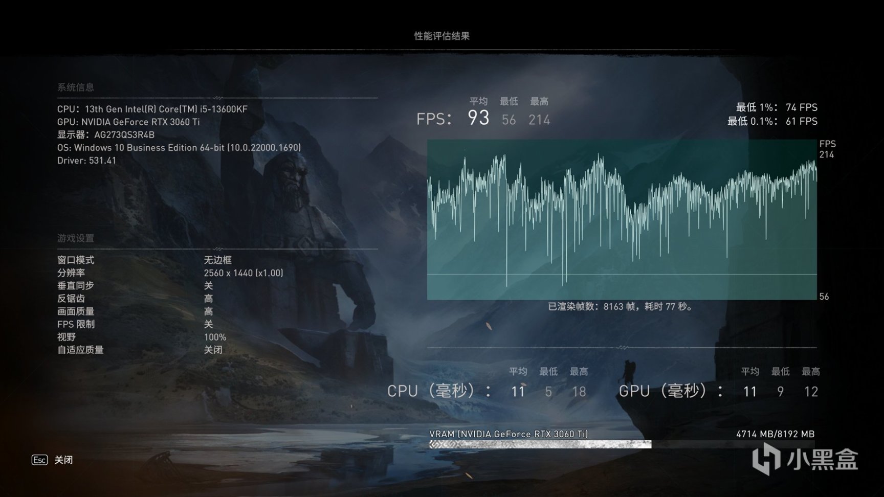 在2077和刺客信条:英灵殿的性能评估测试的帧数表现,鉴于RTX3060ti的性能在2K分辨率不得不调低设置来满足游戏所需要的帧数。