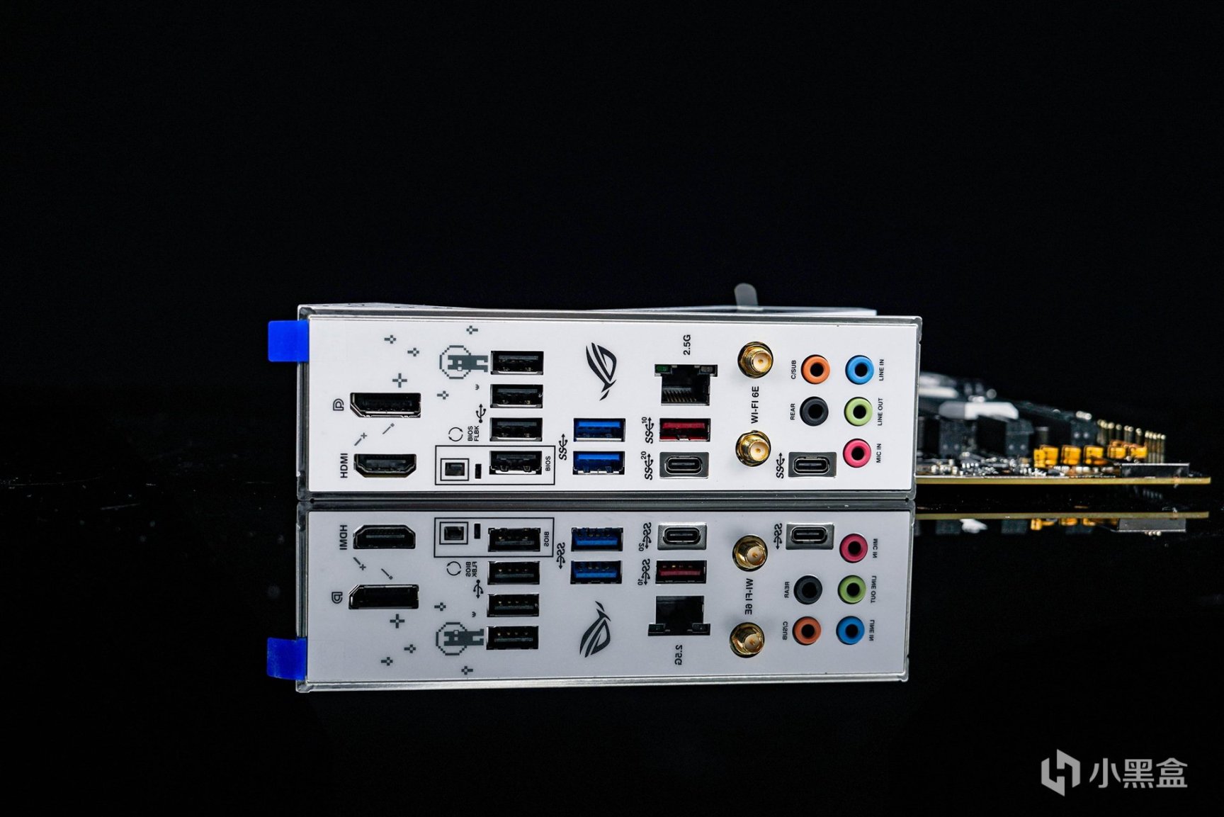 整个面板均采用电竞+像素元素的设计风格,ROG装饰灯也是这代B系列吹雪独有的。一体挡板 IO 配置提供︰HDMI、DisplayPort、四组USB 2.0、三组USB3.2、两组USB-C。ROG SupremeFX 7.1音效、网口2.5Gbe、WIFI6E AX210。整个I/O面板都有功能标识,对于新手来说只需要对应说明书既可了解对应其上面功能标识来安排日常使用需求。