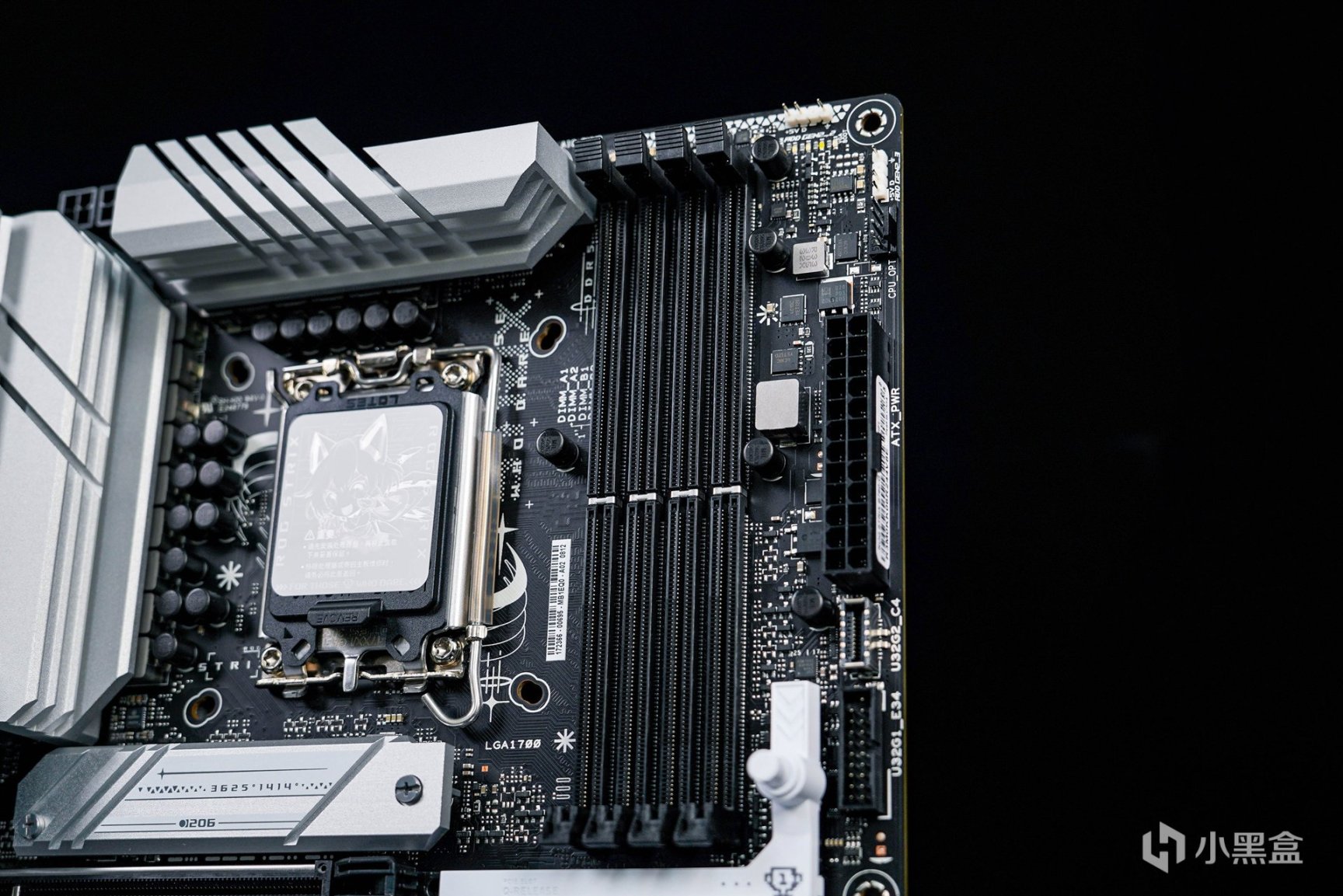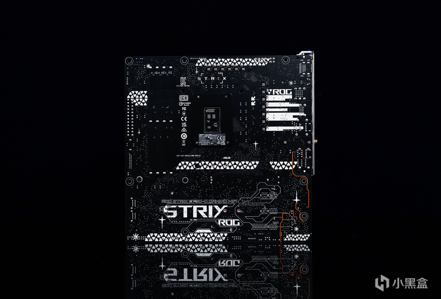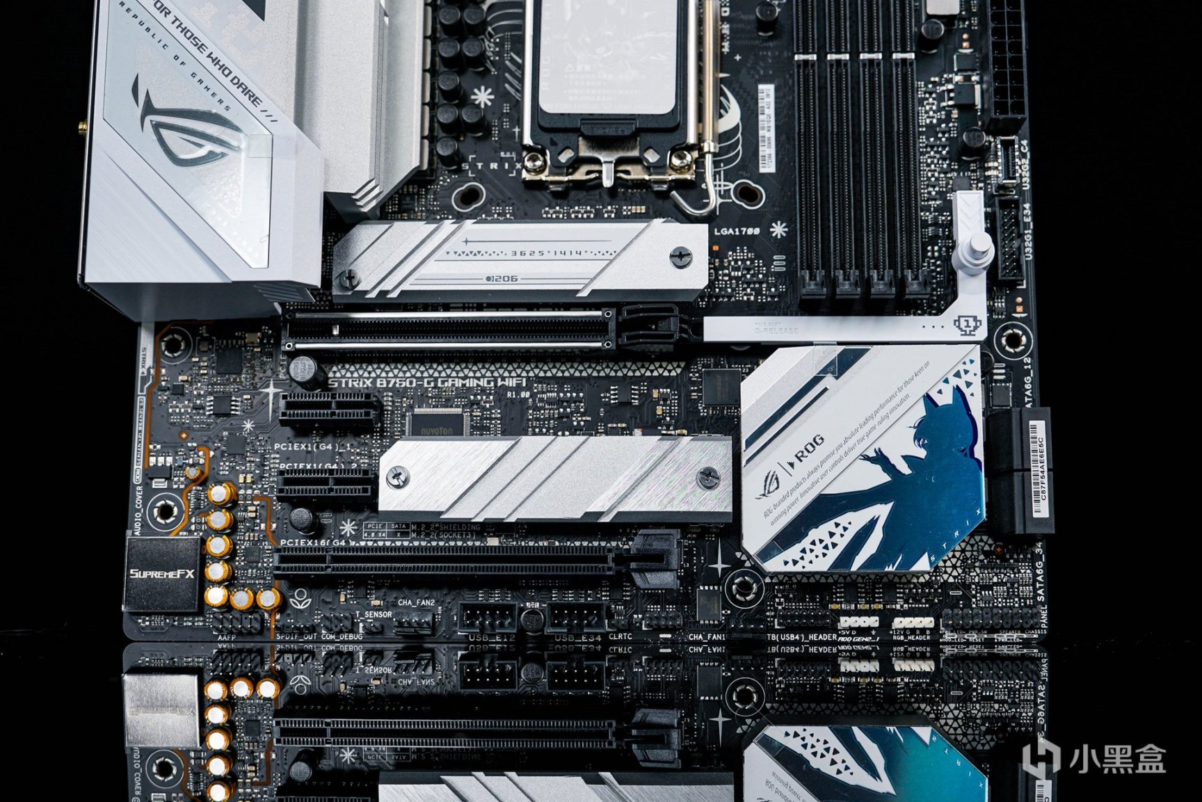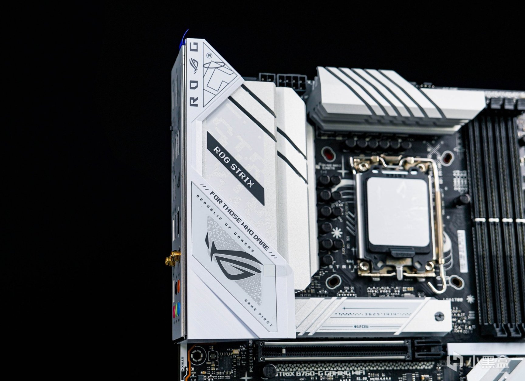 在板面设计上延续吹雪偏爱的“熊猫”配色,银白马甲搭配上黑色PCB。而在外观做出的最大的改变应该是右下芯片散热马甲上的雪舞战姬的LOGO喷涂,背面则采用无马甲背板设计,在背板处不同的地方印有ROG Strix的装饰图案。主板提供了2条PCIe×16插槽和2条PCIe×1插槽,而M.2插口则由两个80MM的PCIe4.0*4插槽承担,主插槽支持最新的PCIe 5.0*16技术,这也得益于新的带宽技术上带来了大幅的提升,为以后搭配采用PCIe5.0技术的旗舰显卡做好了准备。主显卡插槽还加入了上一代吹雪的显卡易拆键设计。