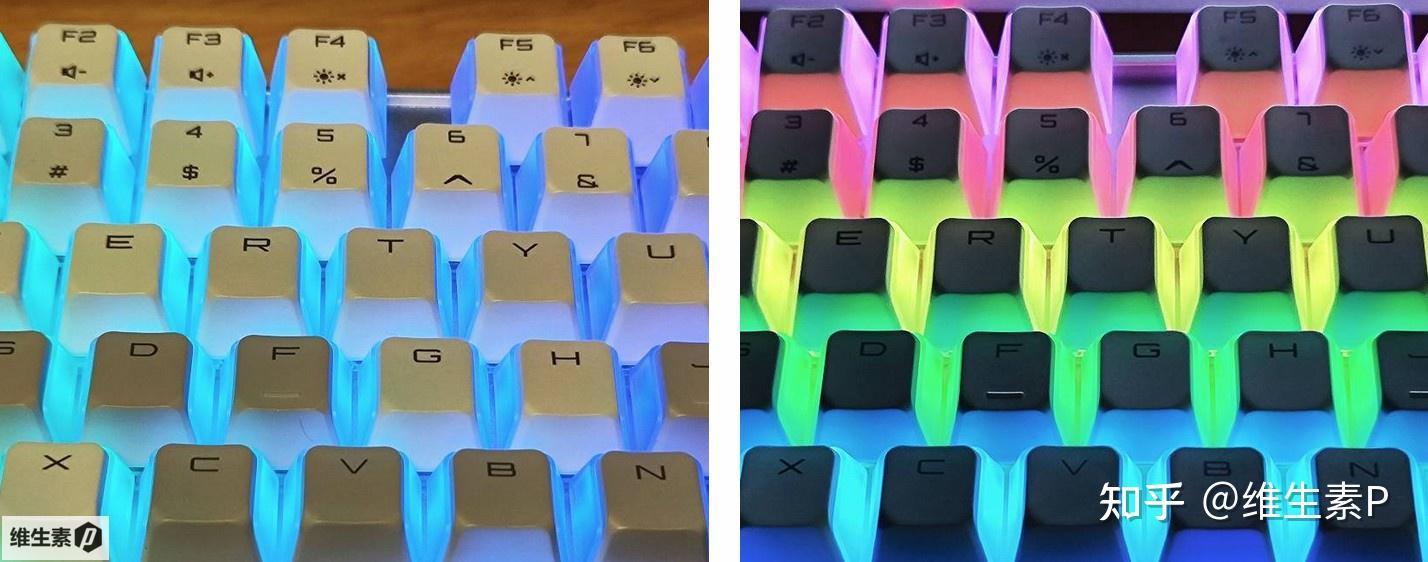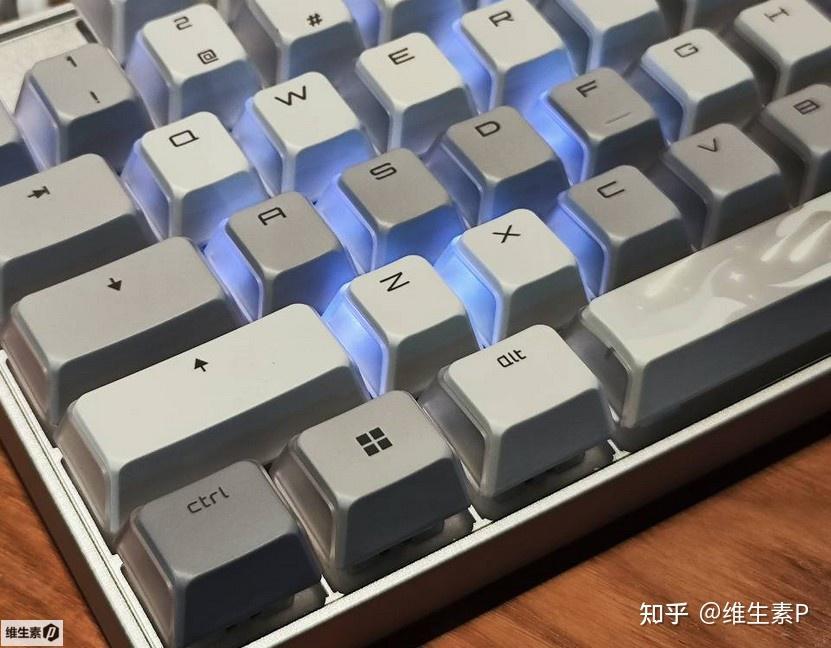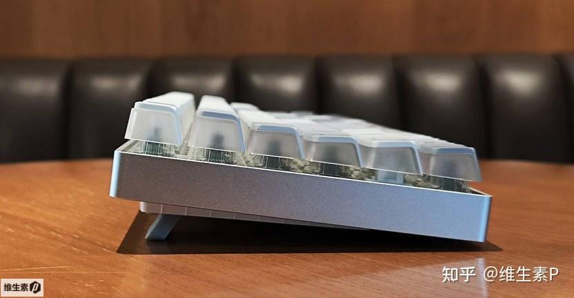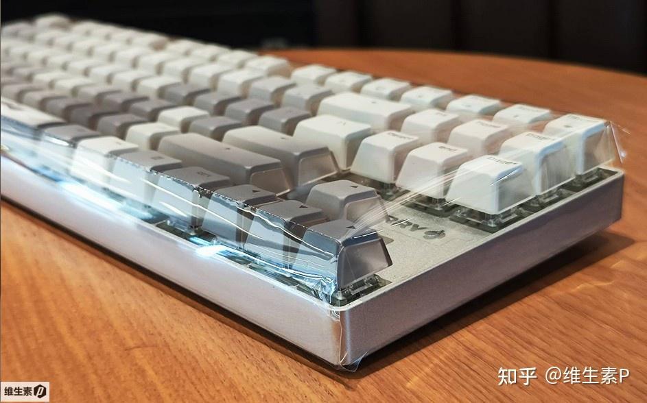 鍵盤的透光設計比較特別,採用的不是完全透明鍵帽,而是對人位這一面做了遮光,是獨特的三透設計。鍵盤的字符沒有做透光,所以在全黑的情況下是隻能靠下位鍵盤微弱反光來看。