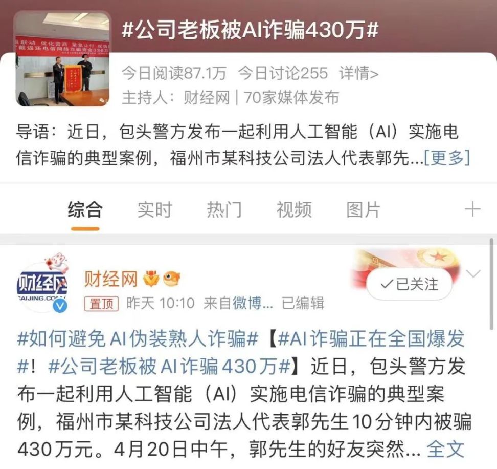 比如最近一起轰动全国的AI诈骗事件,一位公司老板因为自己的微信好友突然找来借钱,直接被骗走430万。
