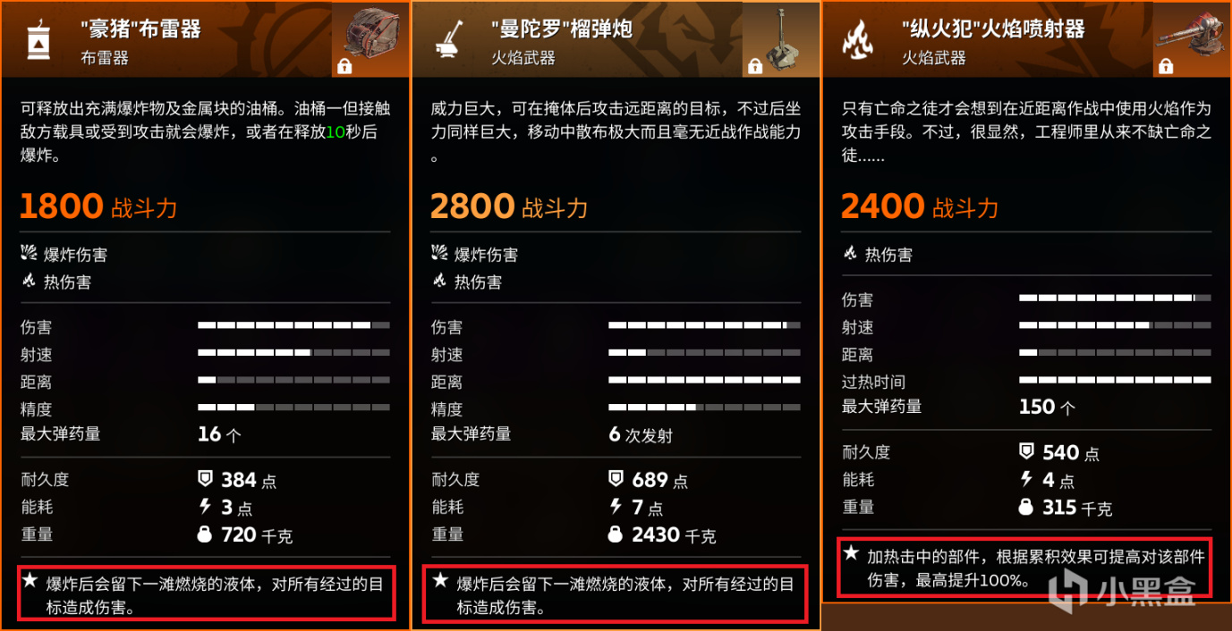 热伤害的来源比较单一,几个知名度比较高的有“豪猪”布雷器、“曼陀罗”榴弹炮和“纵火犯”火焰喷射器。先说豪猪和曼陀罗,这两个武器的特点是爆炸后会留下一滩燃烧的液体,在这个液体的范围内会受到热伤害;而火焰喷射器类就很直观了,通过喷射火焰造成热伤害。造成热伤害的同时会加热击中的部件,增加后续伤害。在火海里待的时间越长,受到的伤害越高。