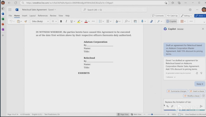 在演示中,Yusuf展示了一份法律文件,并选用了汤森路透提供的Copilot插件,要求AI对合同条款进行修改,并询问这项合同是否适用于加州法律,并对文档调整进行总结。