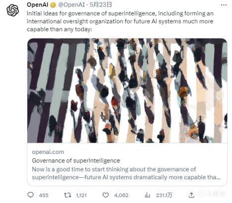5月24日,OpenAI官推發佈消息,奧特曼提出了對“超級智能”(superintelligence)監管的初步想法,希望成立組件一個國際監督組織,其監管能力應該遠超當今的任何組織!