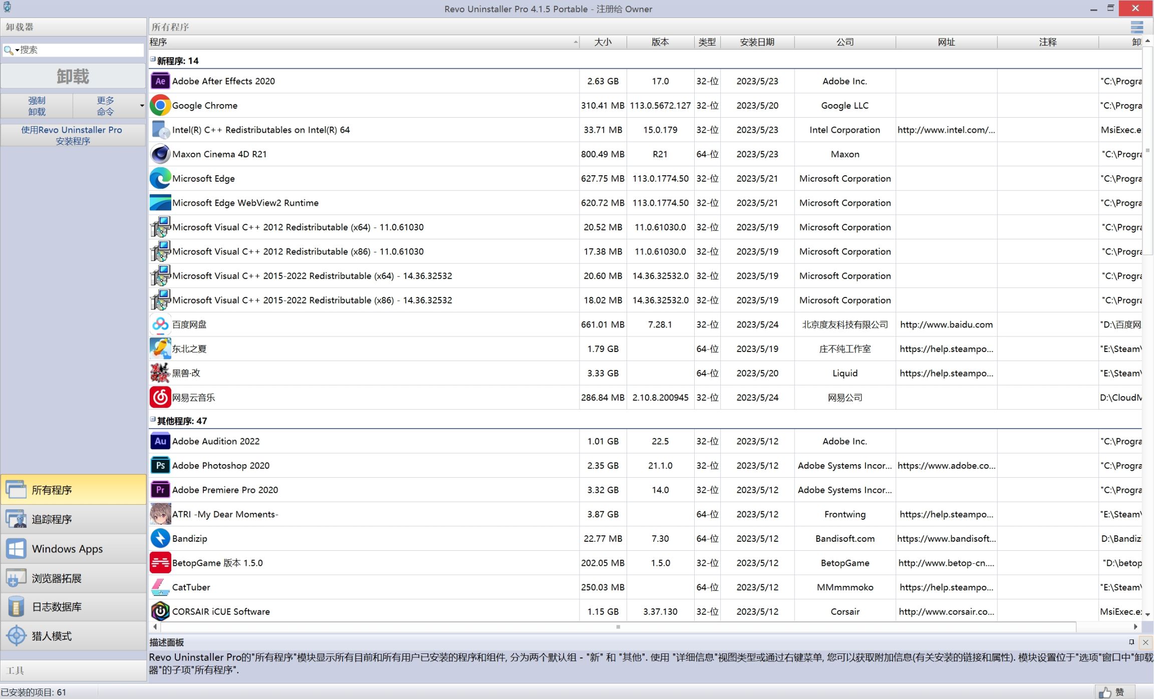 Revo 界面看起來比前兩個稍稍複雜點,所以不太推薦新手小白使用。(都2023年了,大家都鼓搗過電腦了吧?女生除外)功能也要強大的多,我一般都用Revo來刪軟件,感覺它刪的乾淨一些。