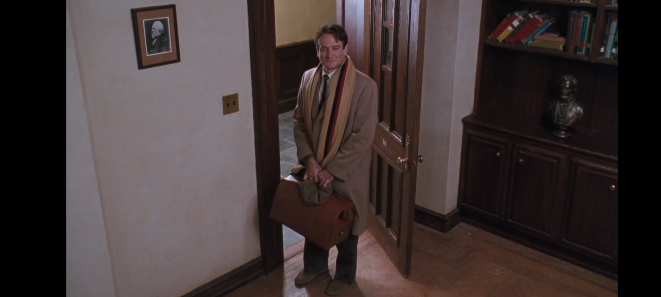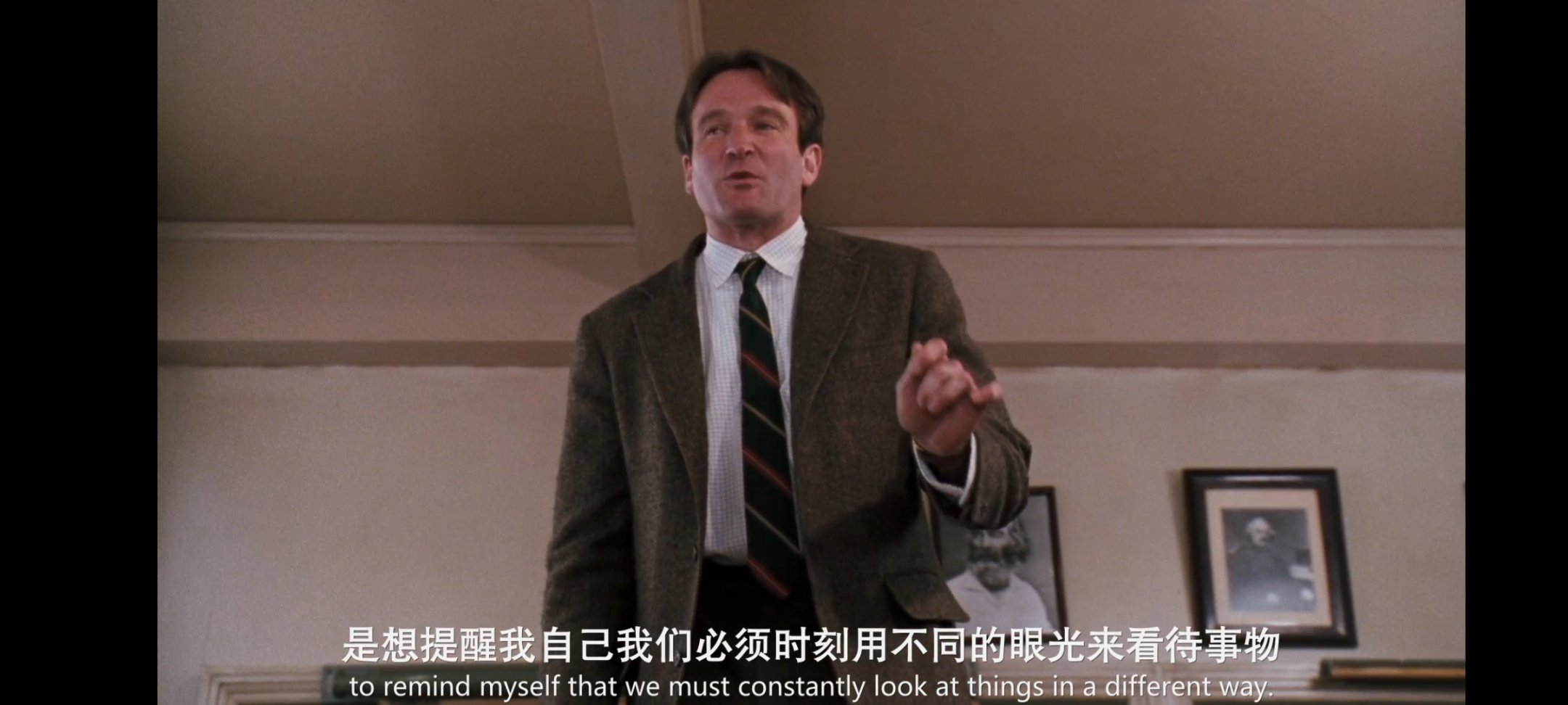 基廷老師是一個什麼樣的人呢?我認爲他是一個存在主義和浪漫主義的集合體,他的教學有趣而又千奇百怪,他讓學生們撕掉課本的前言,因爲那段對詩歌的定義讓他心生厭惡,他讓學生們在庭院奔跑,教他們掌握"自我"的重要性。他教學生們"咆哮",每個人都有無窮的潛力。他站上桌子,告訴學生們登高望遠看待事物的角度也會不同,他與學生們打成一片,沒有任何的架子,相對於其他老師,他是獨特的,也是前衛的。