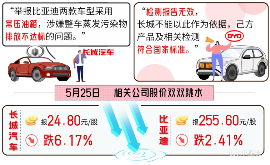 2023年5月25日,在比亚迪宋Pro DM-i冠军版上市后,长城汽车突然发难,举报比亚迪两款汽车污染物排放不达标,比亚迪则回应称“反对不正当竞争”!截至25日收盘,比亚迪股价下跌2.41%,市值蒸发逾183亿元,而作为举报方的长城汽车下跌更多,跌幅6.17%,市值缩水约138亿元,一发举报让两家公司市值蒸发300亿!