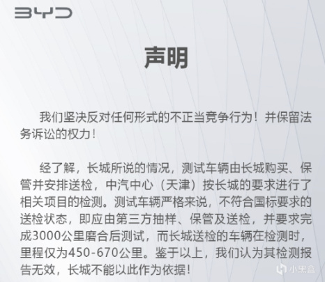 随后比亚迪也发布声明,表示已经了解到长城方面的说法,他们购买了比亚迪相关型号的车辆进行测试,但是测试车辆并不符合国标要求的送检状态,一般要求由第三方抽样、保管及送检,并要求完成3000公里磨合后测试,而长城送检的车辆在检测时,里程仅为450-670公里。