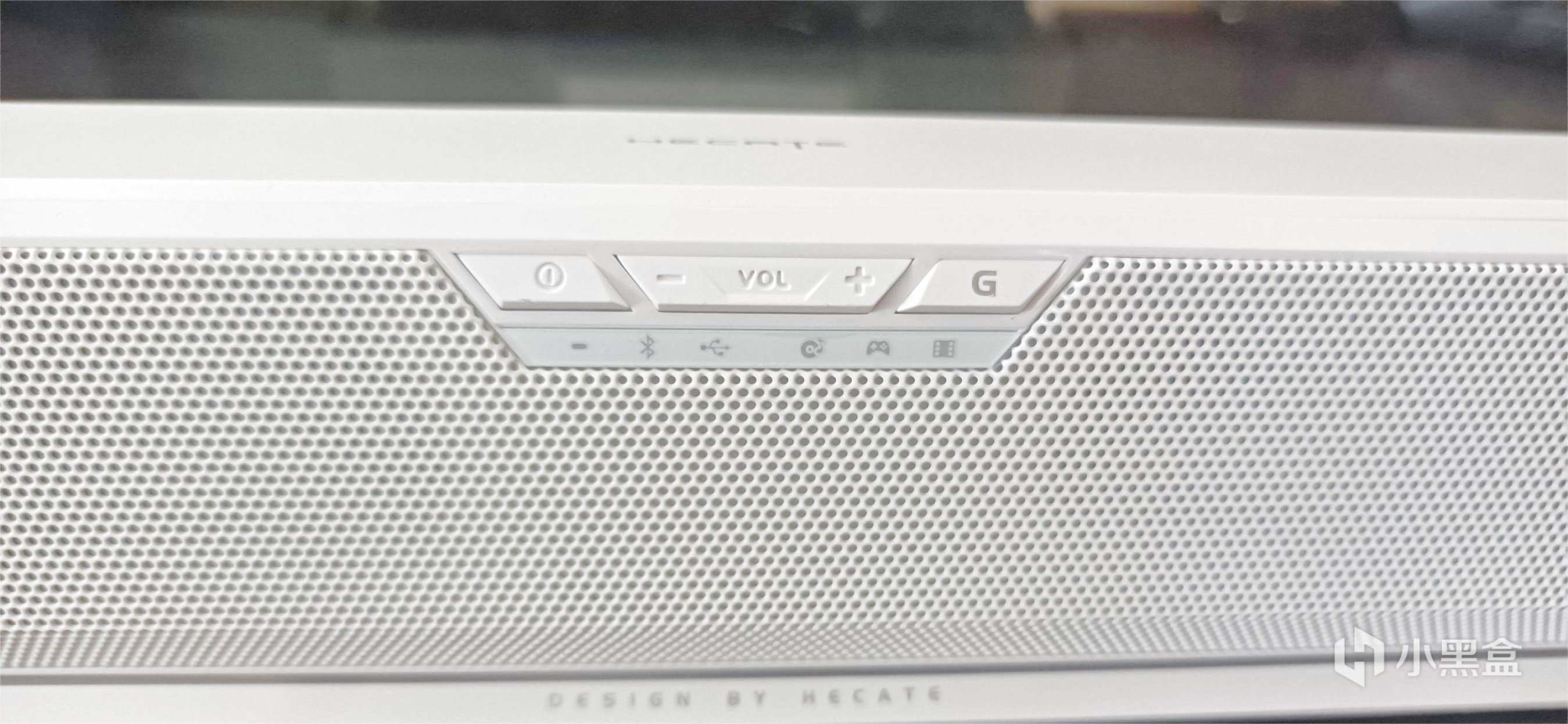 音響正面有4個按鍵: 開關、加減音量和模式切換操作。整體來看非常傻瓜式的操作,按一下開關鍵就可以切換藍牙和聲卡模式,按一下模式鍵,就可以在音樂,遊戲和電影三個模式進行選擇。不過,如果調節聲音的時候,用旋鈕替換按鍵將會絕殺。